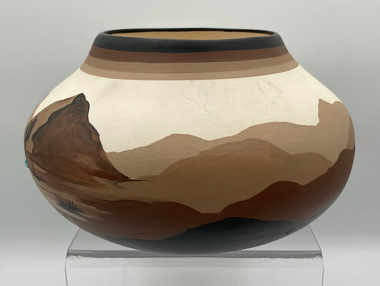 Vintage Studio Art Pottery - Native American Vase - Painted Wagon, Cactus, Mountains - Signed “PG” /s