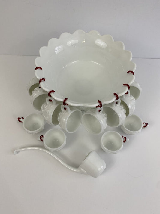 Rare Westmoreland Panel Grape White Milk Glass Pedestal Punch Bowl Set Ladle Cups Hangers /rb