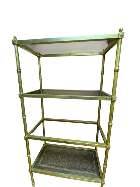 Mid Century Modern Bookcase with 4 glass shelves and 1 wicker shelf