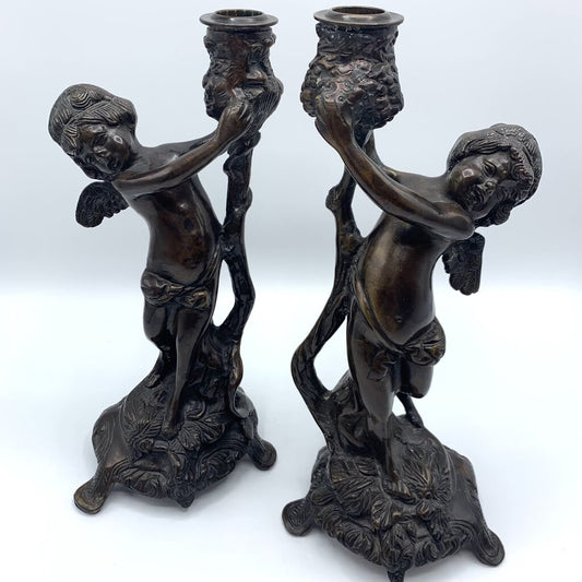 Vintage Bronze Art Nouveau-Style Cherub Candlesticks /hg