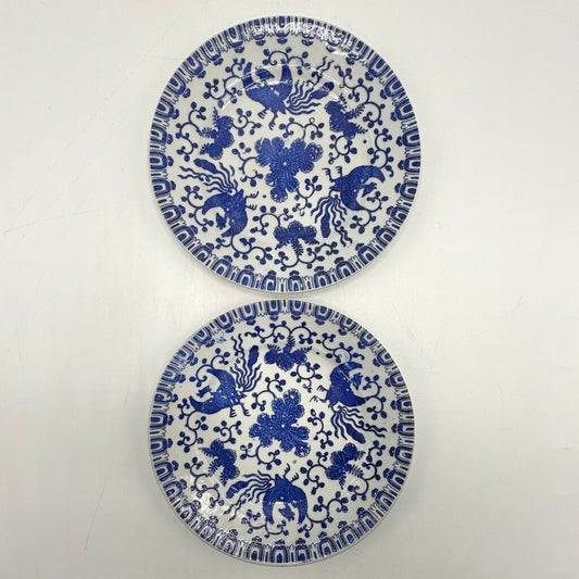 Set of 2 Vintage Flying Phoenix Blue & White Japanese Porcelain 7 1/2” Salad Plates /cb
