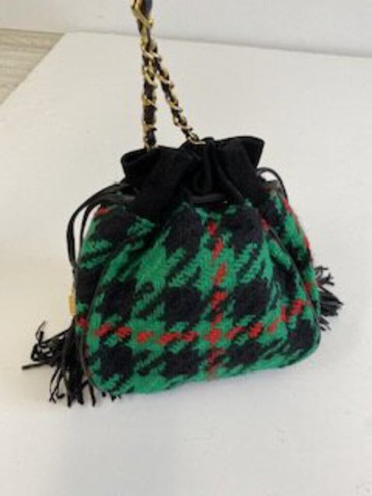 Vintage 1990s Carlisle Green/Black/Red Wool Drawstring Evening Bag /roh