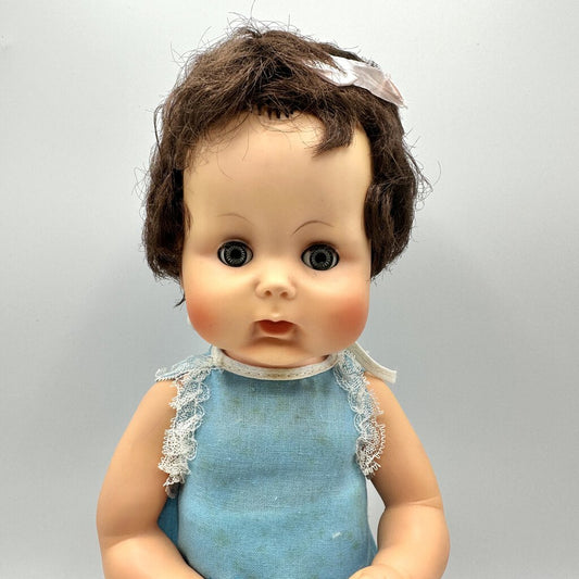 Vintage Unmarked 14” Vinyl Drink Baby Doll In Original Outfit w/Bottle/cb