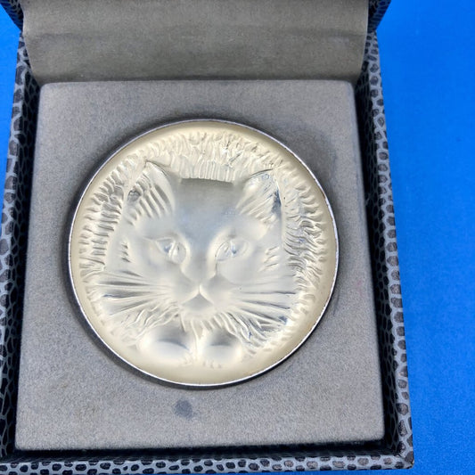 Retired 1988 Lalique Paris Cat Chat Satin Soft Yellow Crystal Brooch w/ Box /b
