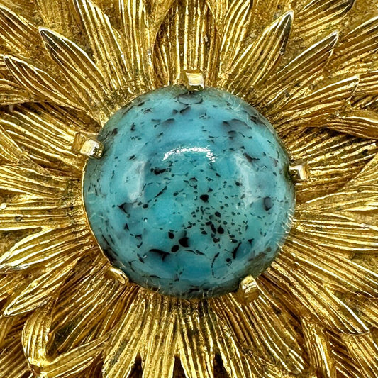 Vintage Benedikt NY Brutalist Faux Turquoise Gold Tone Starburst Brooch/Pendant Signed /cb