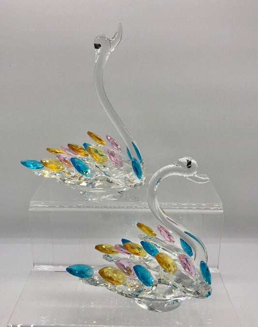 Pair of Sparkling Crystal Swans Figurines w/ Colored Feathers /b