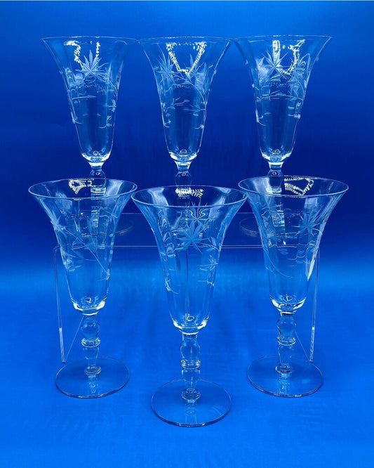 Vintage 1940’s Floral Etched Slender Wine Glass Set of 6 /b