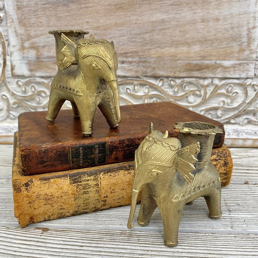 Vintage Brass DHOKRA Elephant Candlestick Pair /cb