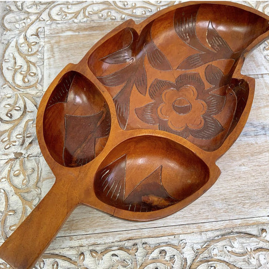 Vintage Carved Wood Leaf-Shaped Divided Bowl /cb