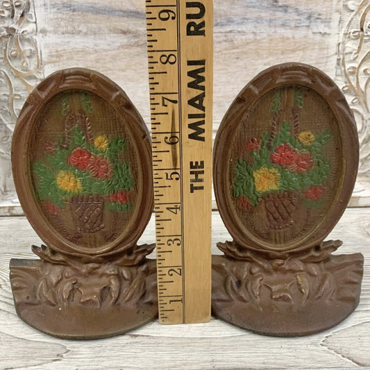 Antique Cast Iron Oval Flower Basket Medallions Bookends/Doorstops /cb