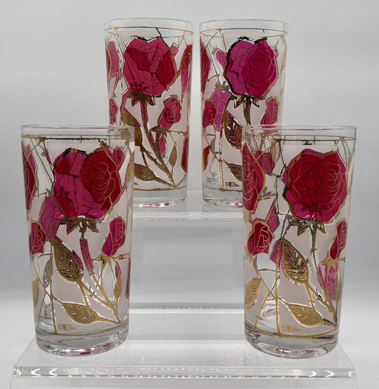 Set of 4 MCM Cora Rose & 22k Gold High Ball Glasses Tumbler /b