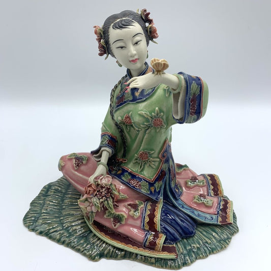Vintage Shiwan Wucai Porcelain Qing Dynasty Lady with Butterfly Figurine /hgo