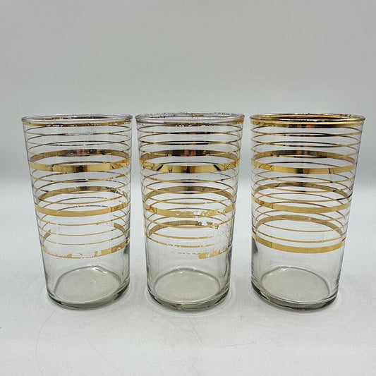 Set Of 3 MCM 4 1/2” Highball Glasses Gold Band Vintage Barware /cb
