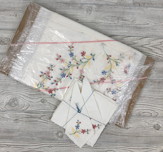 Vtg Large Embroidered Linen Tablecloth w/ Matching Napkins /b