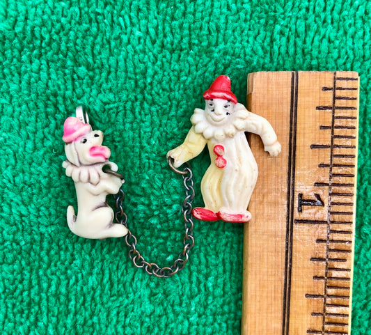 1950s/60s Circus Clown w/ Dog Dble Pin Brooch /b