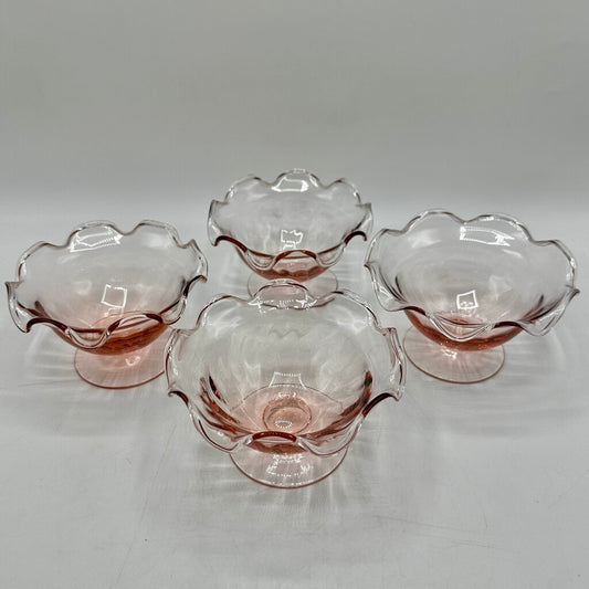 Set of 4 Vintage Pink Ruffled Footed Optic Sherbet/Dessert Bowls /cb