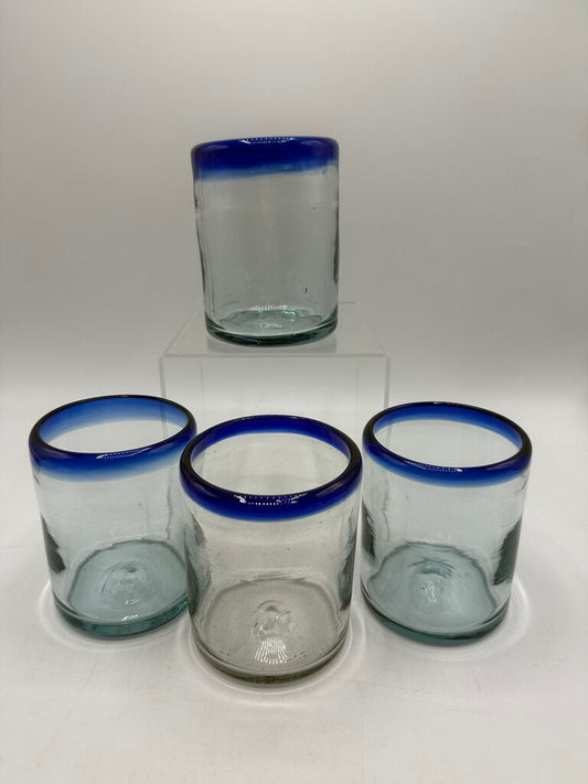 Set of 4 Hand Blown Mexican Bubble Glass 4” Blue Rim /rw