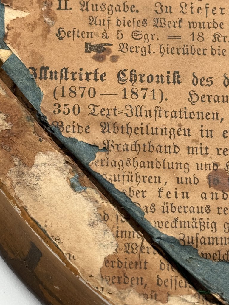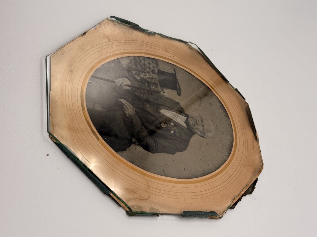 Antique glass plate photography of a Handsome Dignified Gentleman with his Top Hat by his side and cane in his hand wearing his medals on his chest. This photograph is a glass plate that measure approximately 4” x 6” and the man’s medals and shirt are hand colored. The photograph is in a round oval wood frame and held in place by a pages from a book in German. The frame does have some damage. Overall a unique interesting piece of history and art.