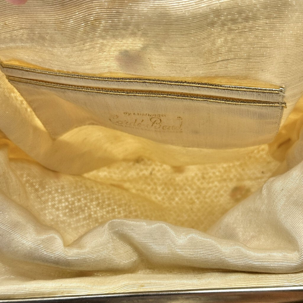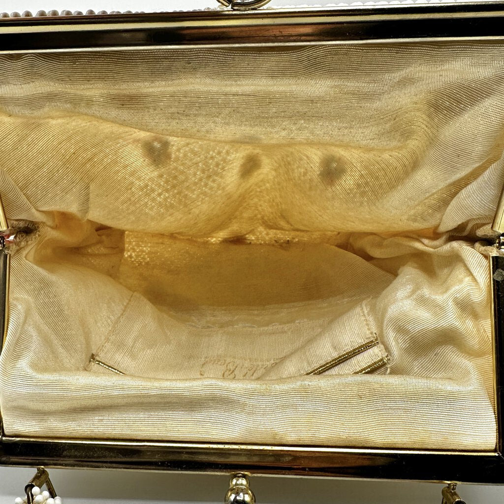 1950s Cordé Bead by Lumured ivory beaded evening/cocktail handbag. Features ivory and clear beads as well as delicate floral embroidery. Has a unique kissing lock closure. Ivory fabric lining with two small interior pockets. Measures approximately 8” tall, 9” wide, 2”deep and has a 6 1/2” handle drop. In very nice vintage condition, it is missing one of the clear beads and the interior shows light staining and fading. The cold tone hardware has light wear and the lock is a little hard to open and close, it requires some extra strength. This bag is roomy and will accommodate a phone. Please carefully review the photos for condition details.