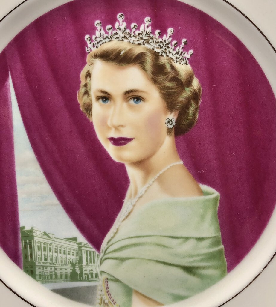 It was to commemorate the coronation of the Queen June 2, 1953. The artist, Allen Hughes, painted the striking new Queen with Buckingham Palace just outside the curtain.