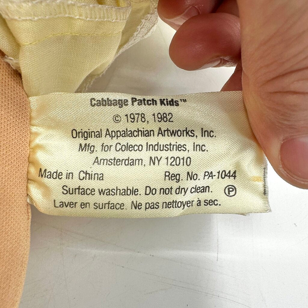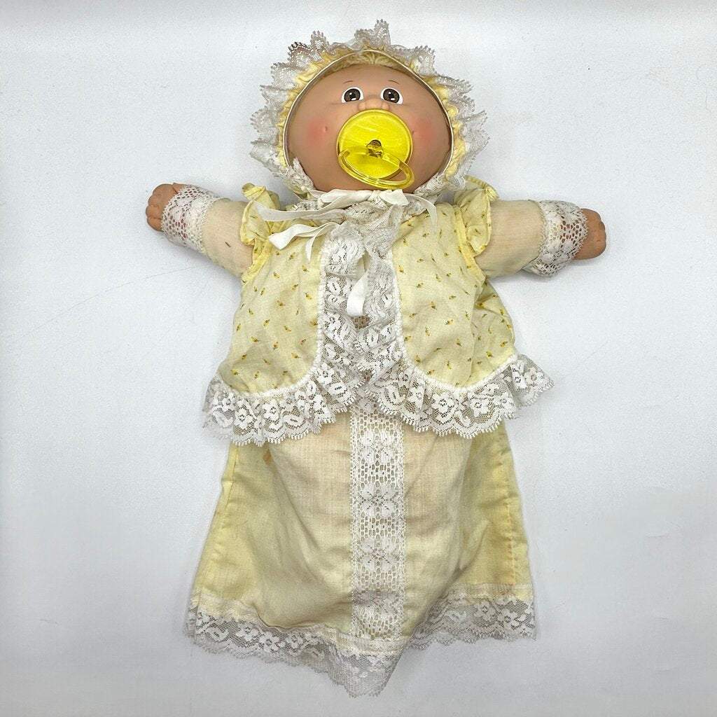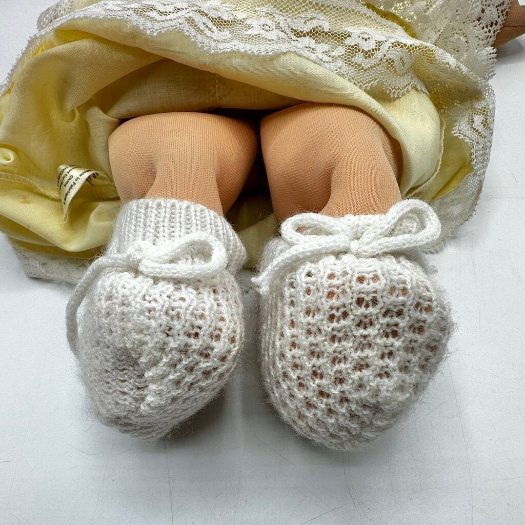 This little sweetheart was made by Coleco in 1985 according to the blue signature on its tush. The doll is 14” tall, has a cute tuft of blonde yarn hair, brown eyes and wears its original outfit, a yellow floral gown with lace trim, matching cap, white booties, and yellow pacifier. It is missing its diaper.