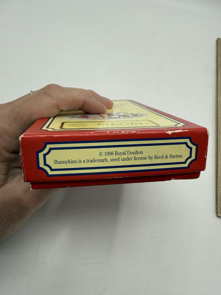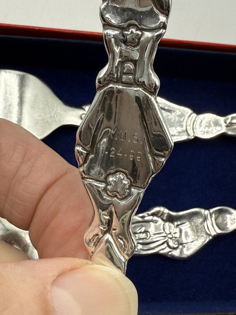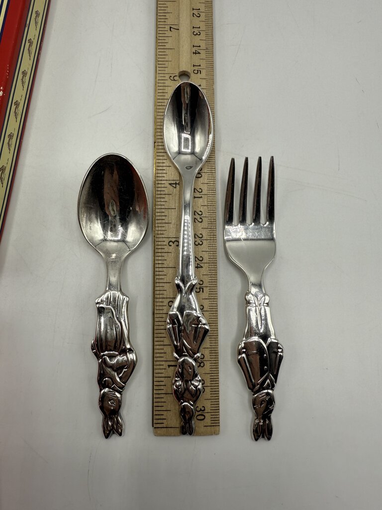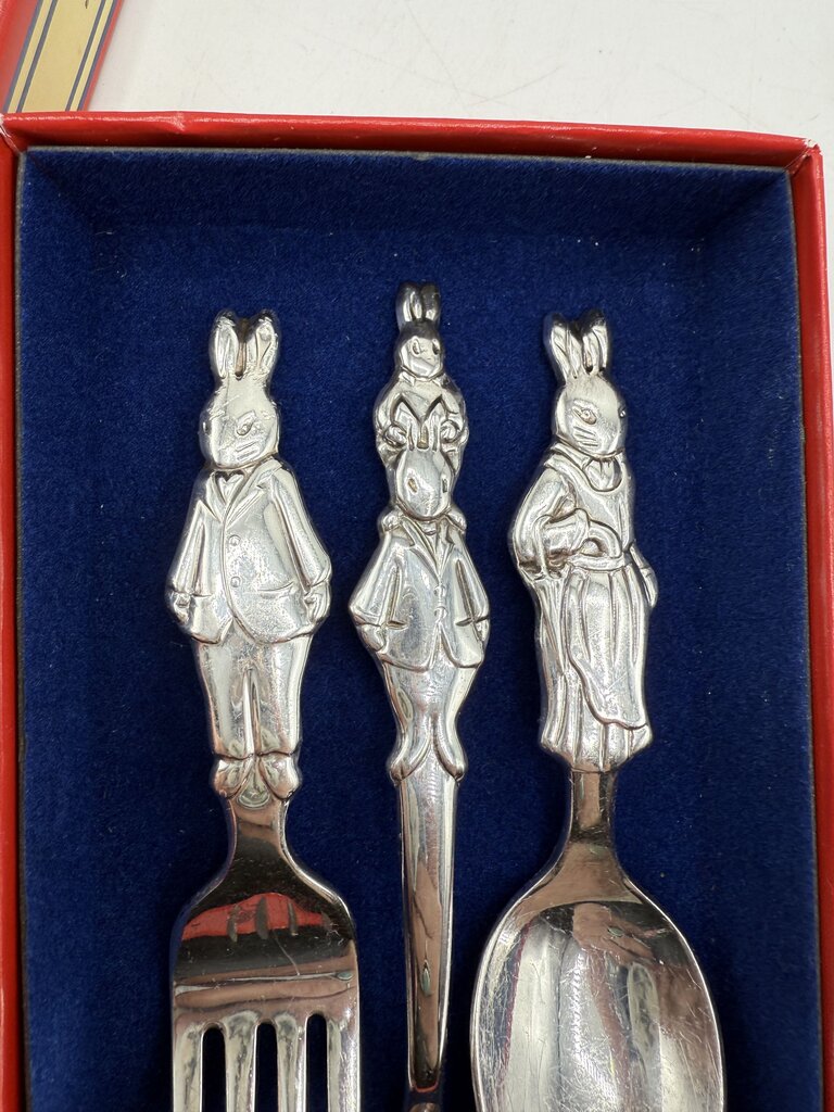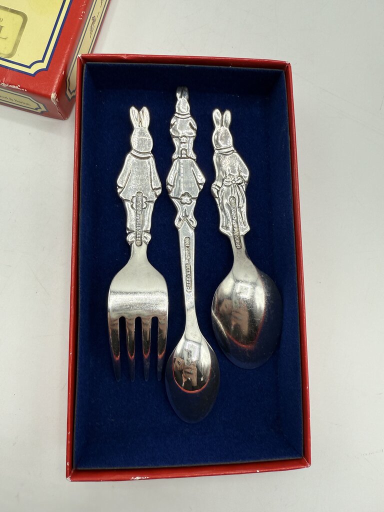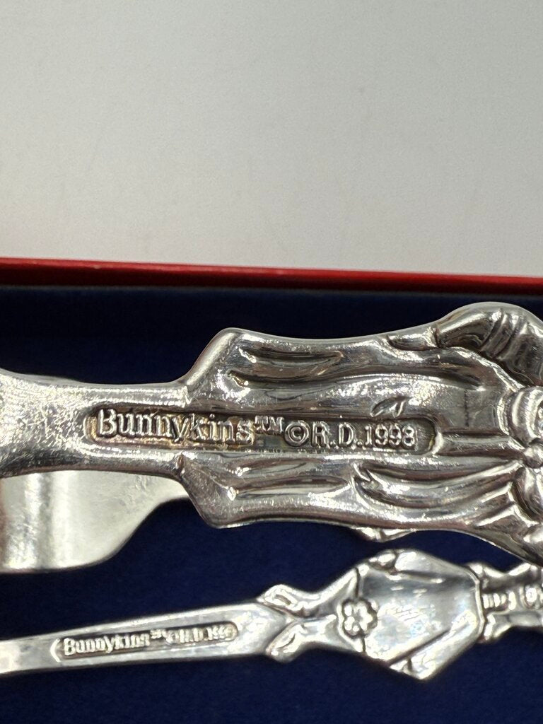 1998 vintage 3 piece flatware set by Royal Doulton in the Bunnykins pattern. Silverplate baby spoon, youth spoon and youth fork. Light scratches from use. Adorable bunnies on the handles. In original box.