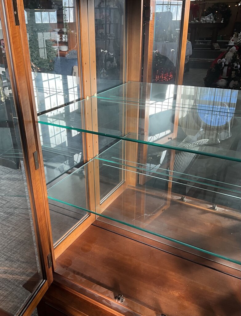 This dining hutch is in great condition and has no damage! Has a beautiful cherry finish with 2 drawers that work perfectly fine! Four glass shelves that can be adjusted. The doors below open to reveal a two single shelves for storage.