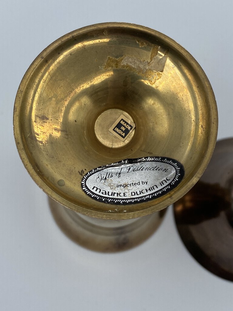 Set of 2 different size solid brass goblets by Gift of Distinction imported by Maurice Dutchin Co.. 1970’ies vibe is found with these two brass goblets. One is 7” tall and 3.5” in diameter, the other one is 6” tall and 4” in diameter. Weight is 1lb 2 ounces. No dents in metal, could use an overall polish is a shine is desired. Great decor pieces.