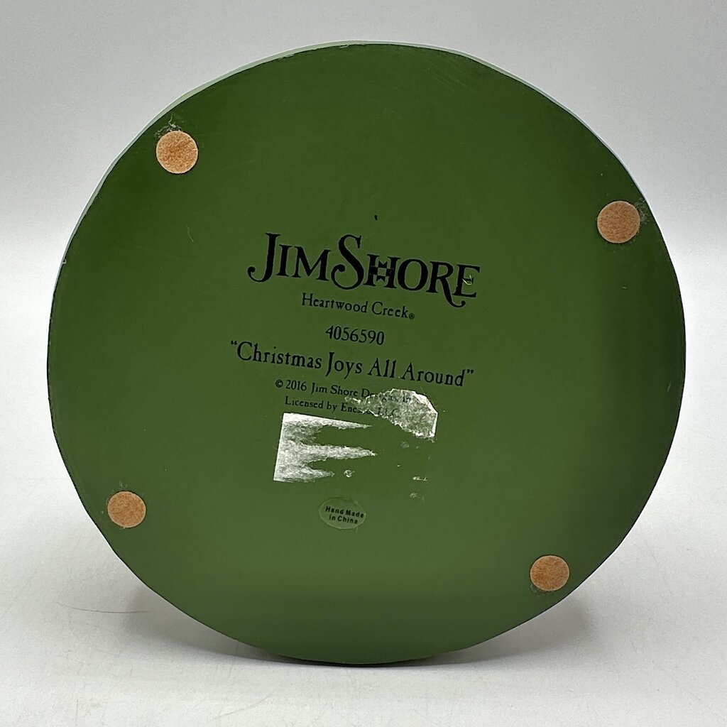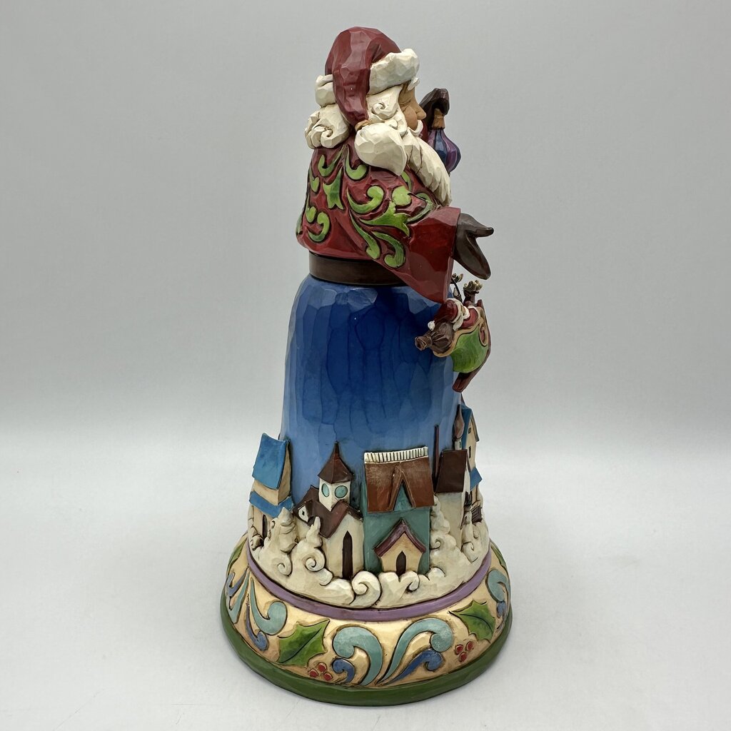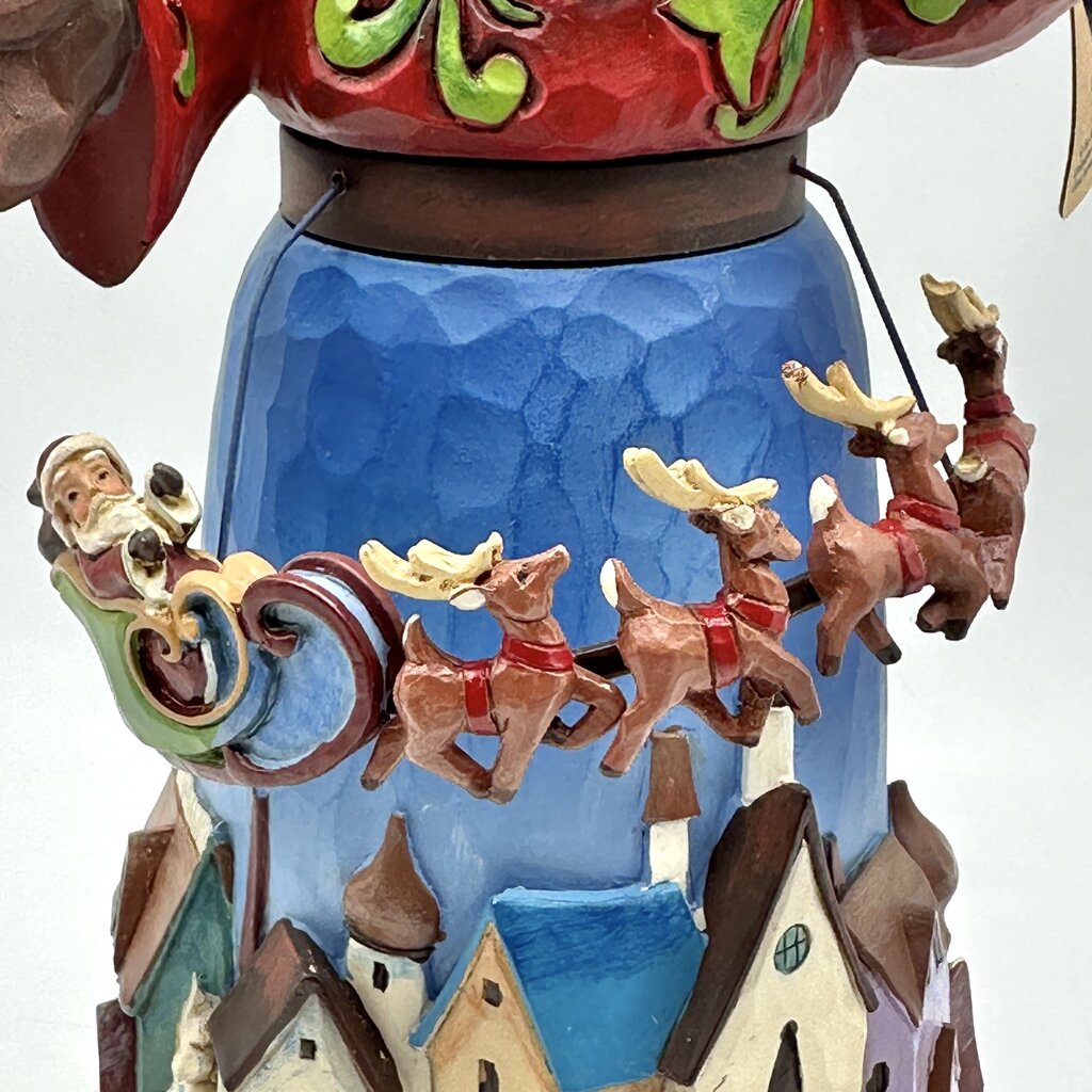 2016 Enesco Jim Shore Heartwood Creek “Christmas Joy All Around” Santa with rotating sleigh figurine 4056590. It is made of resin and features the intricate whimsical folk art designs Jim Shore is known and loved for. This kindly Santa features Santa’s sleigh pulled by reindeer that rotates around the figurine when pushed.
