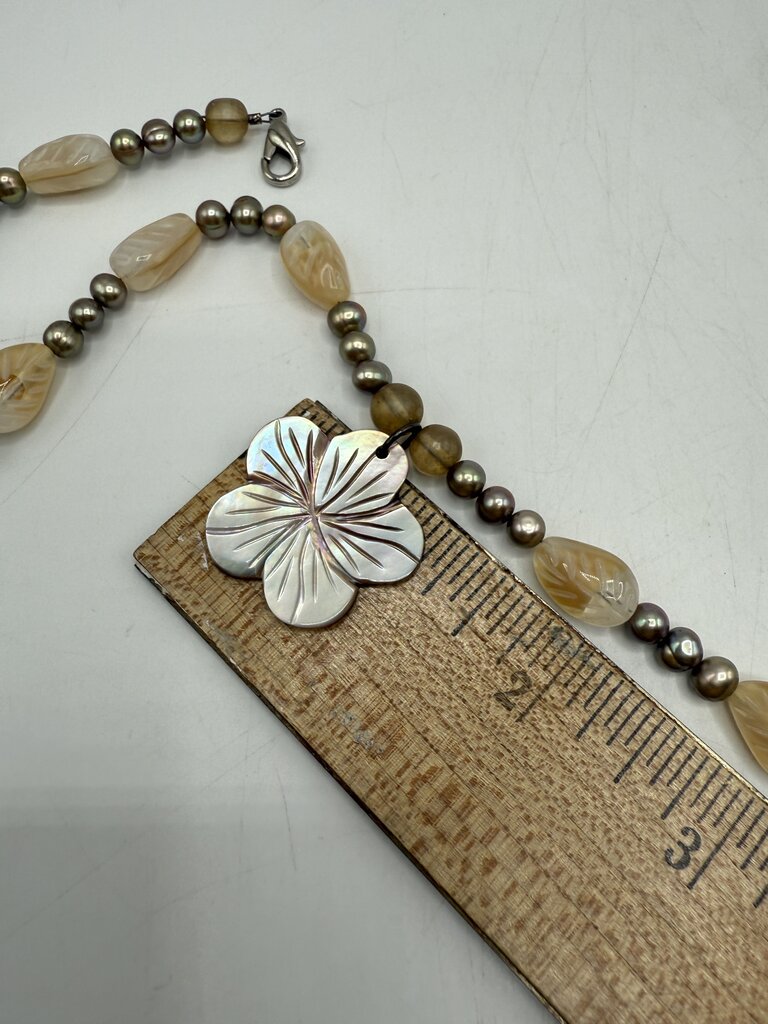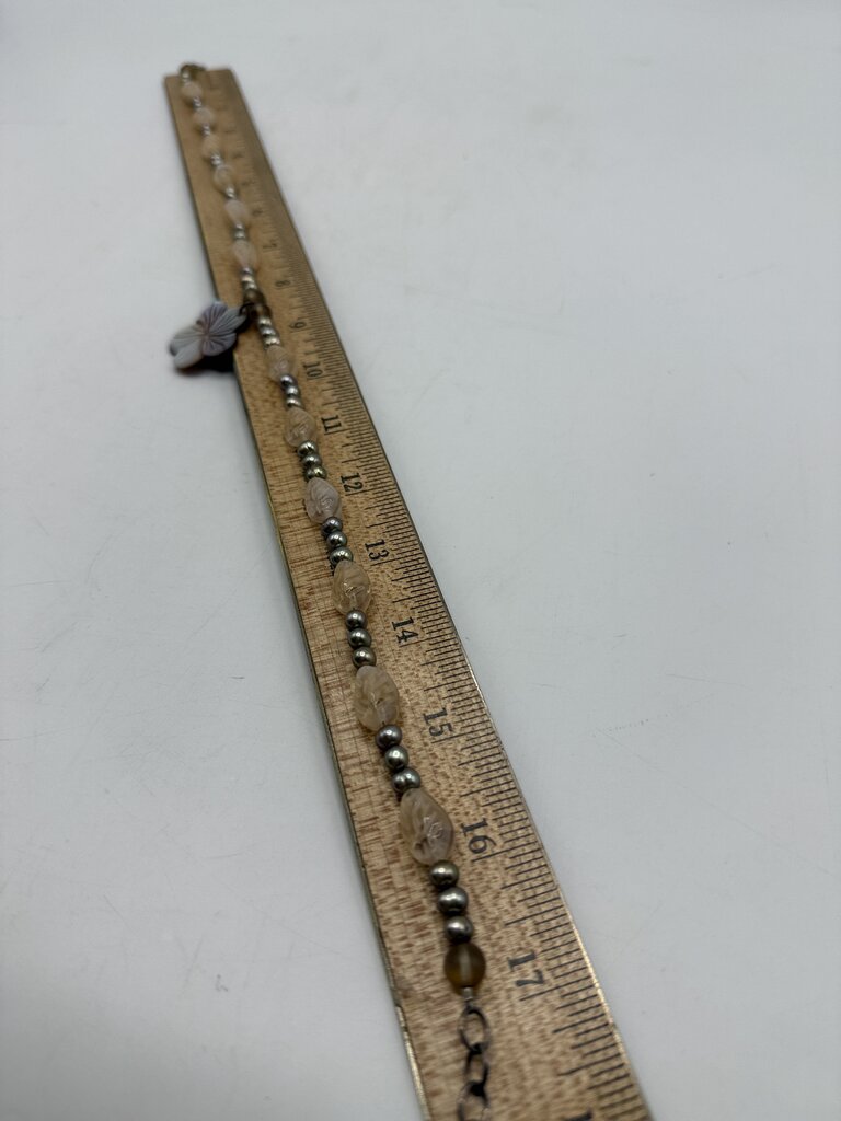 This necklace and earring set is made of glass beads shaped in a leaf pattern with silver toned metal beads in between each glass bead. Glass beads are a soft peach and white color. No damage found.