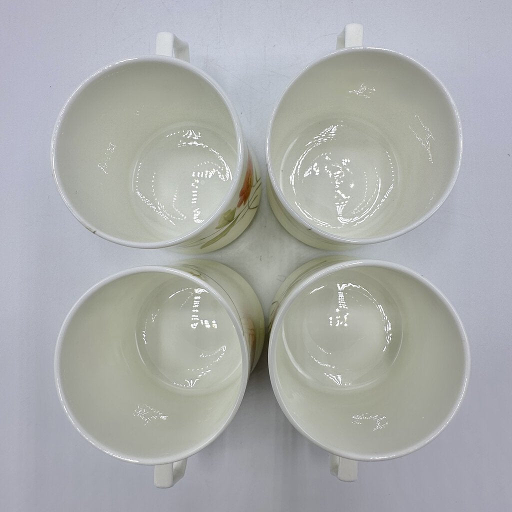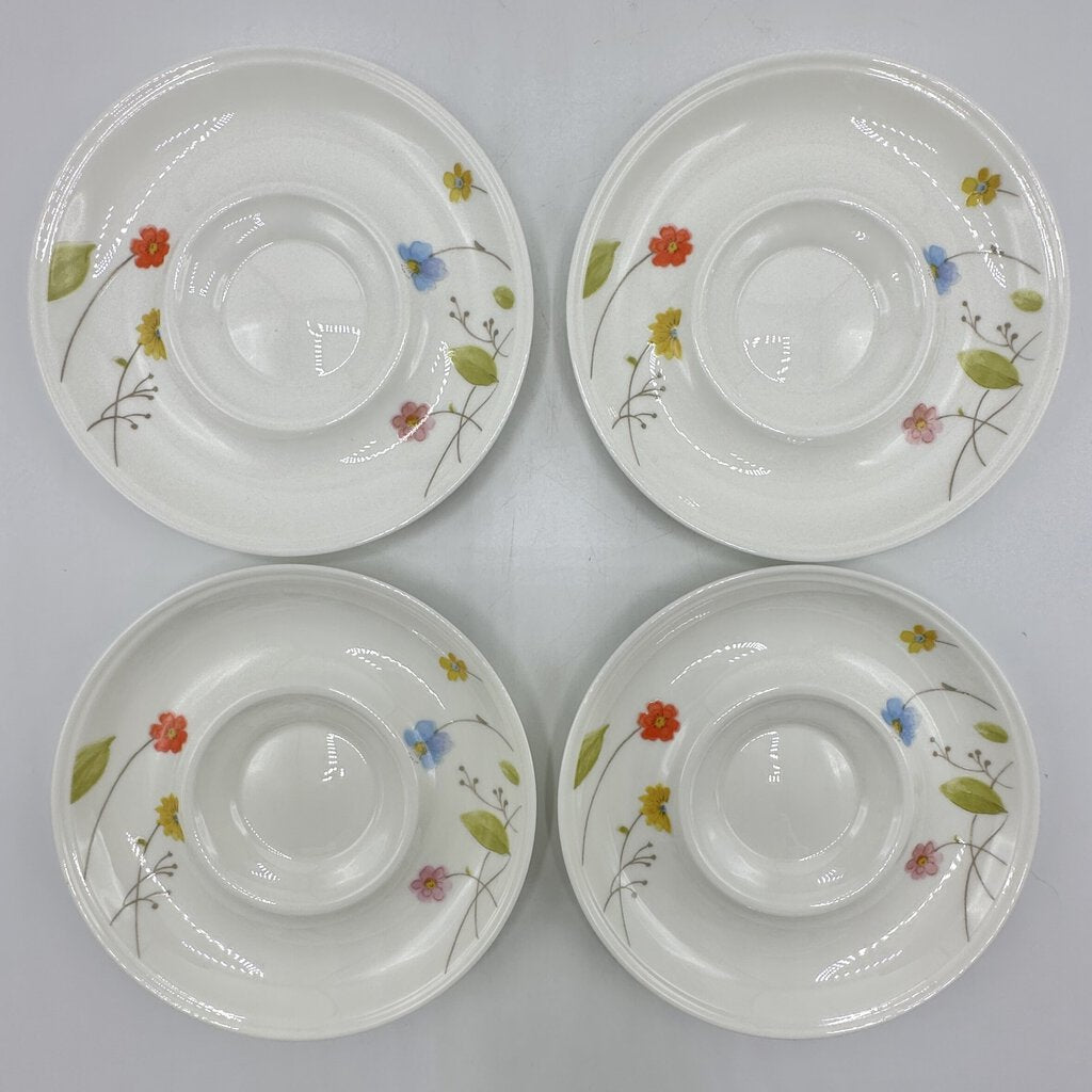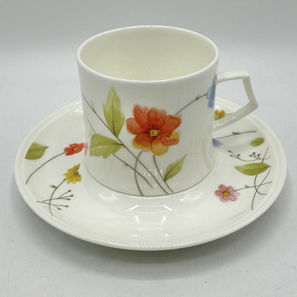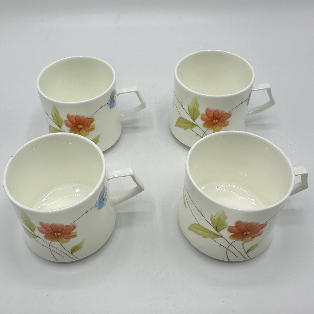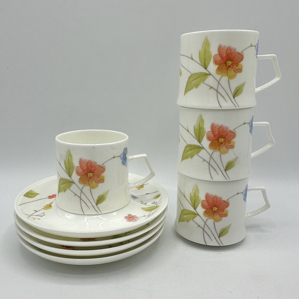Four vintage Mikasa JUST FLOWERS demitasse and saucer sets. Crafted in Japan from 1974-1996. They feature coral, yellow and blue flowers on a lovely white bone china background. The cups are 2 3/8 inches tall and have a 2 3/8 inch diameter. the saucers measure 5 1/8 inches. They are in excellent vintage condition. No chips, cracks, crazing or signs of wear. They appear unused. Please carefully review the photos for condition details. Estate item. Condition is pre owned.