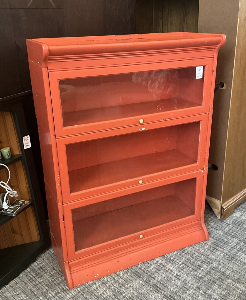 This stacker bookcase is in decent condition, however, it does have quite a few scratches and markings around the piece. Still such a unique bookcase and can be re-painted or just left the same with the sienna color. Has 3 doors that all open and close fine.