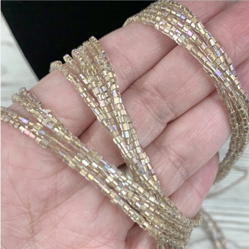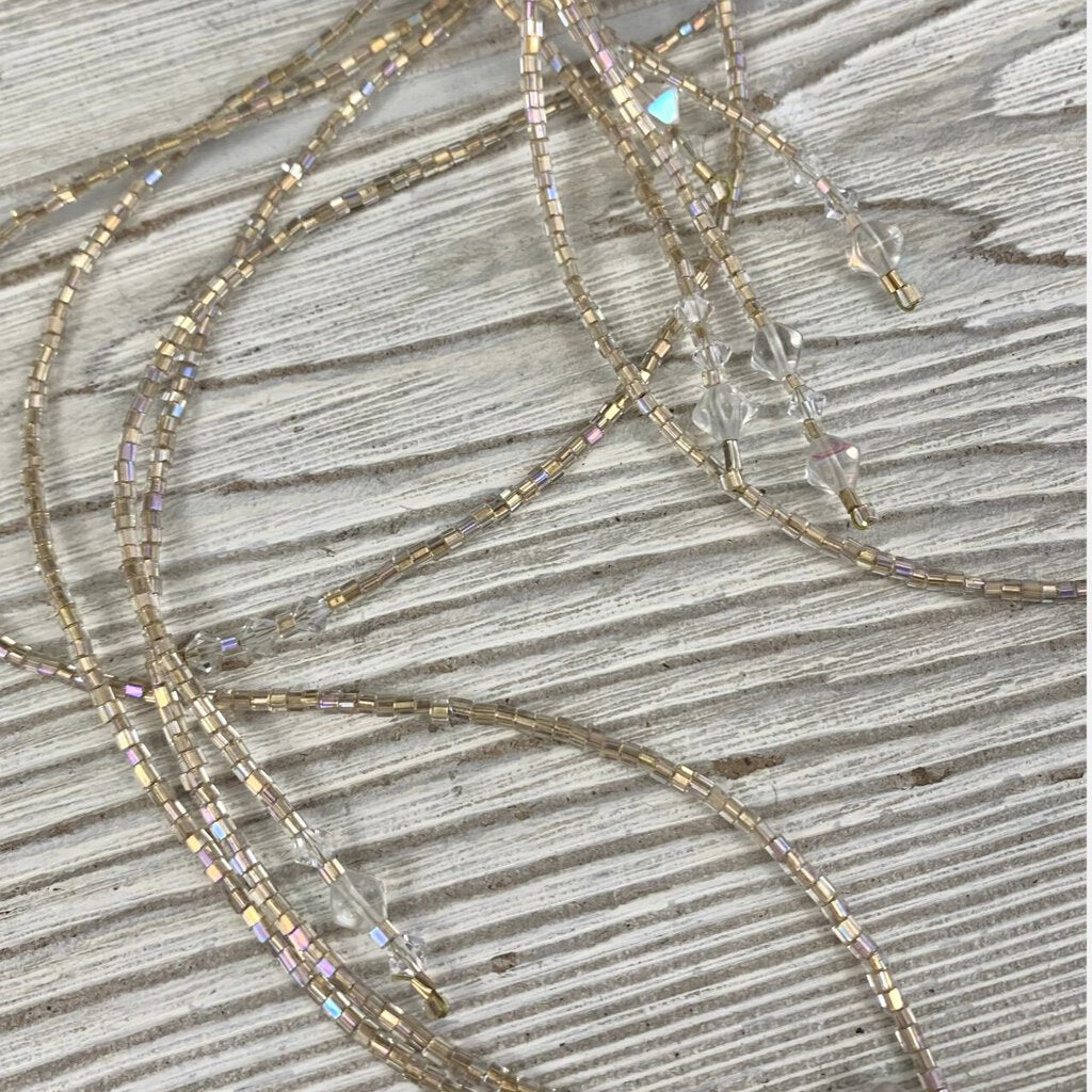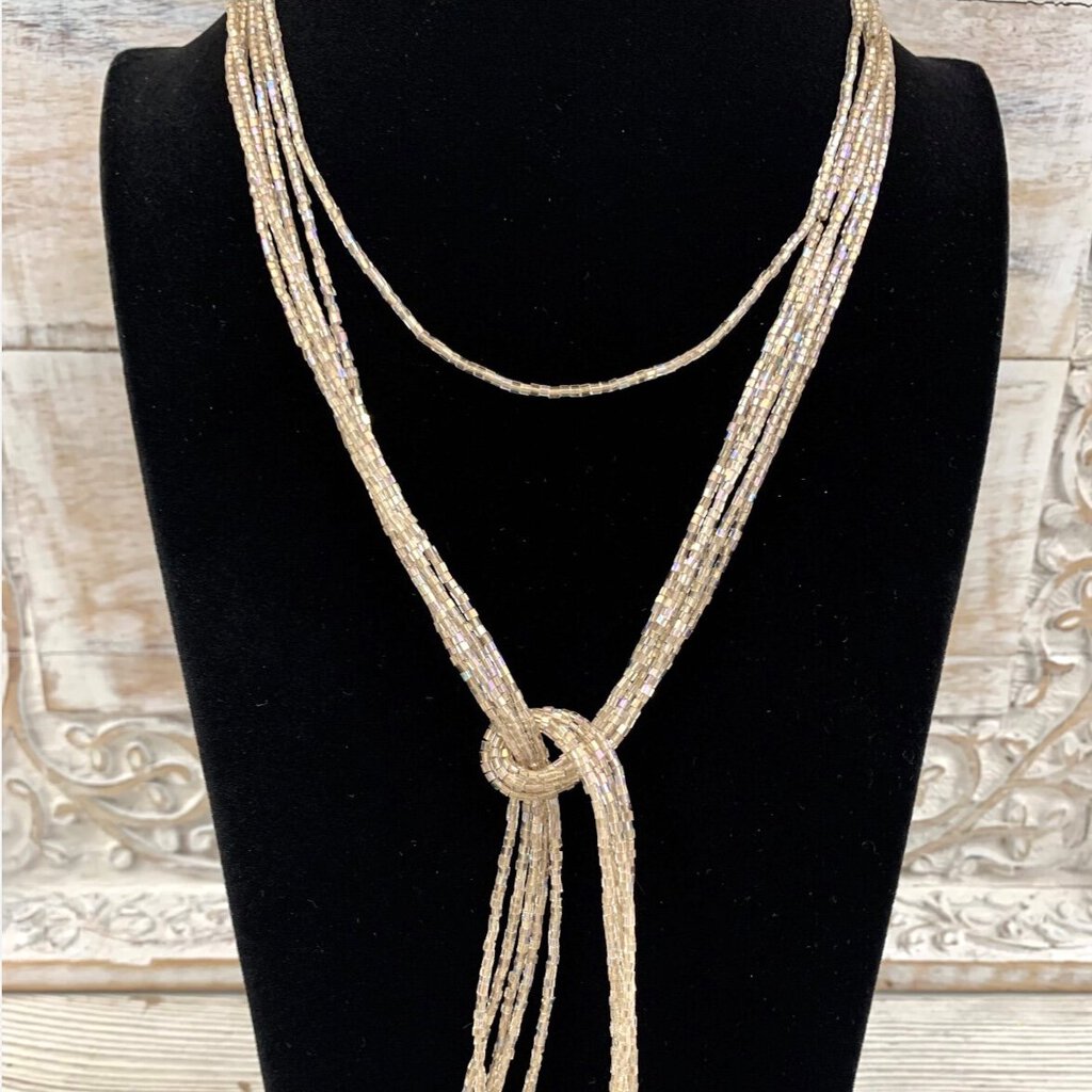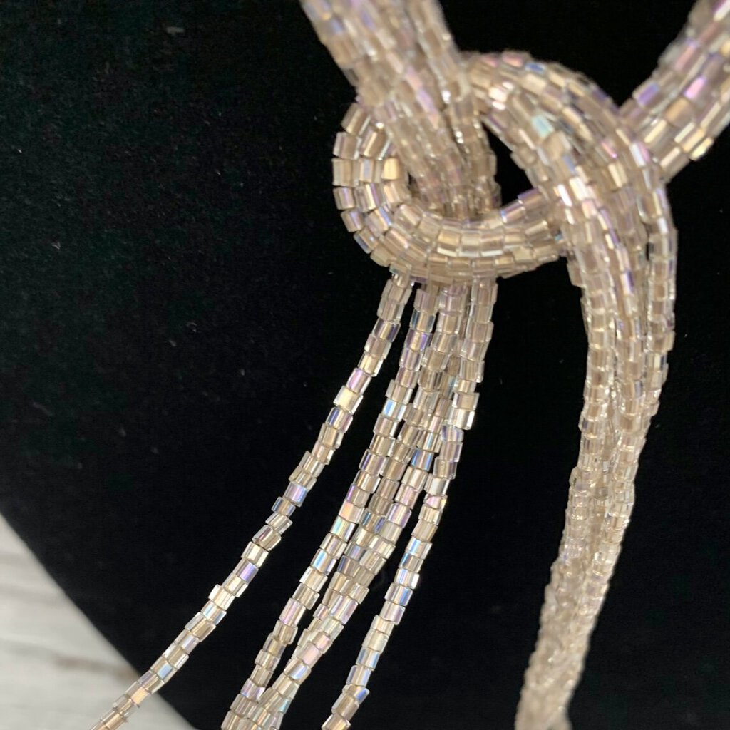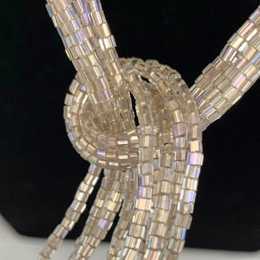 So much sparkle to this stunning 5 strand glass and crystal beaded lariat. Can be worn tied closer to the neck, or lower depending on your preference. Also comes with a single strand stretchy choker necklace for extra wearing options. This piece is handmade and many many hours went into the painstaking beading. It’s simply gorgeous, and the pictures don’t do it justice as there is so much more sparkle than the pictures convey. The lariat was estate-owned and is in excellent condition. No issues found. Take a moment to view the pictures for further condition reference. The strand lengths vary but the longest strand measures about 52 1/2” from end-to-end.