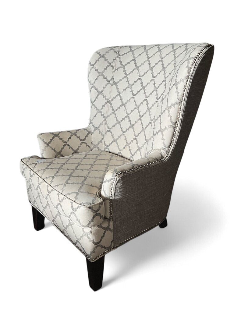This chair is in great condition and has no damage or rips in the upholstery! Has a classic white and gray colored upholstery with nail head buttons along the outside of the chair. Such a beautiful and modern styled chair!