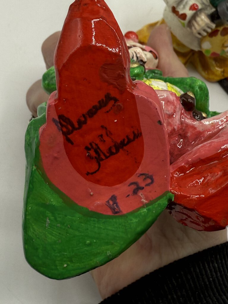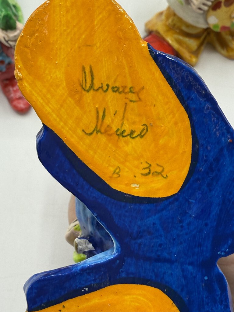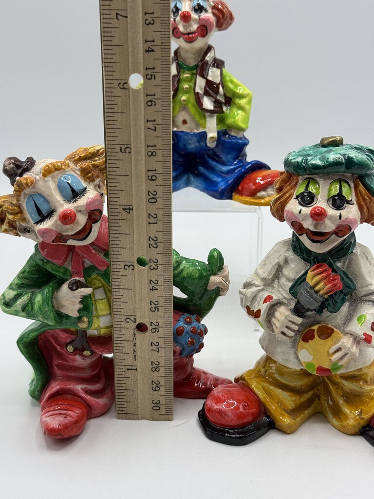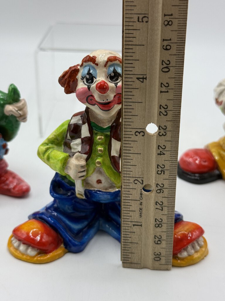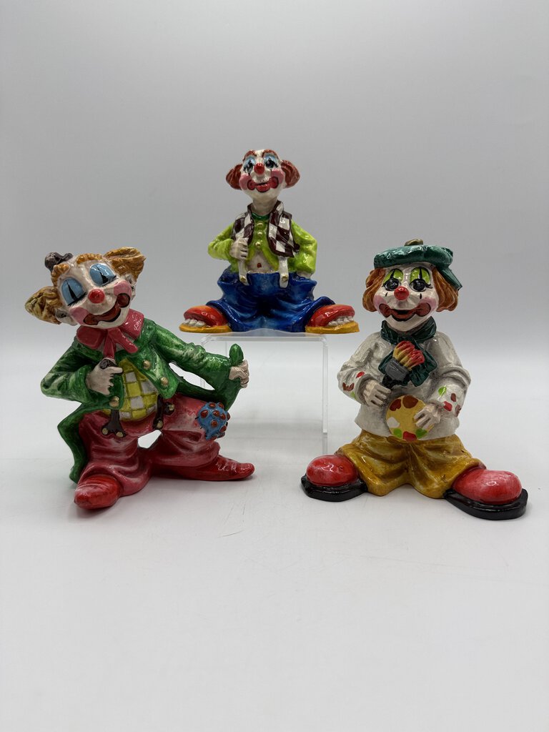 Estate set of 3 different Colorful Circus Clowns all made of paper Mache by the artist Alvarez. Clowns stand 4” to 5” tall. Made in Mexico. All are signed by artist. No damage found.
