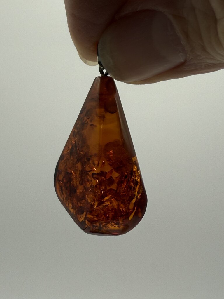 Estate jewelry, attractive, polished amber gemstone necklace pendant. Measures approximately 1.5” long by 1” wide with a silver bail. Nice color.