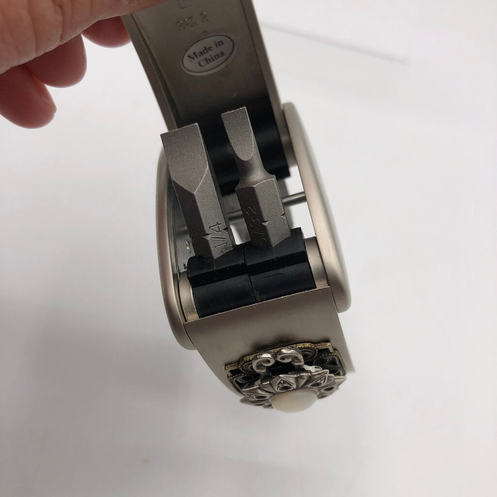 This embellished Ann Cichon Dallas screw bit case holds four different sized flat and phillips head screw bit.