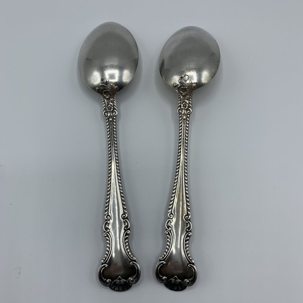 Stunning and ornate set/2 antique sterling serving spoons made by The Alvin Silver Company in the early 1900s. The pattern is called “Cambridge” and it features a beautiful floral design with rope detailing on the border of the spoons. One of the spoons is engraved with the letter “E.”