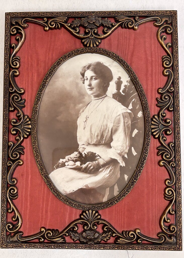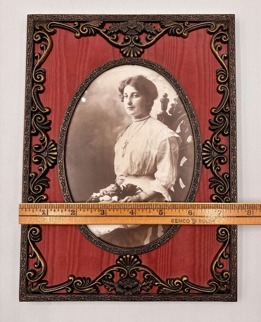 Beautiful brass filigree table top frame with silk backing. The ornate frame is rectangular with an oval cut out for a photo. The edges are brass filigree with a deep pink/maroon silk behind the filigree. It currently has a photo of a young woman taken in NYC in 1916. She is identified in the frame. This pre-owned frame and photo is in excellent condition.