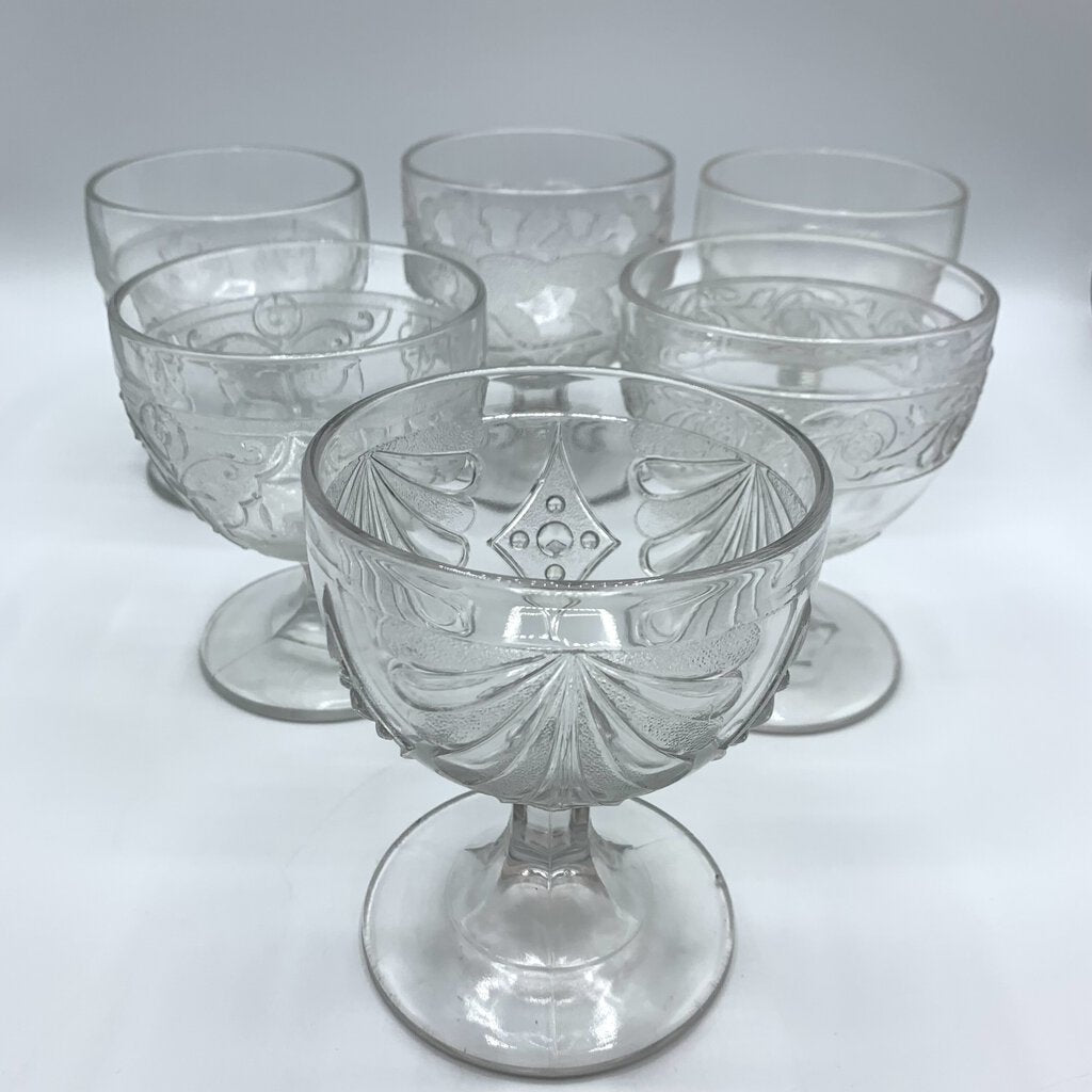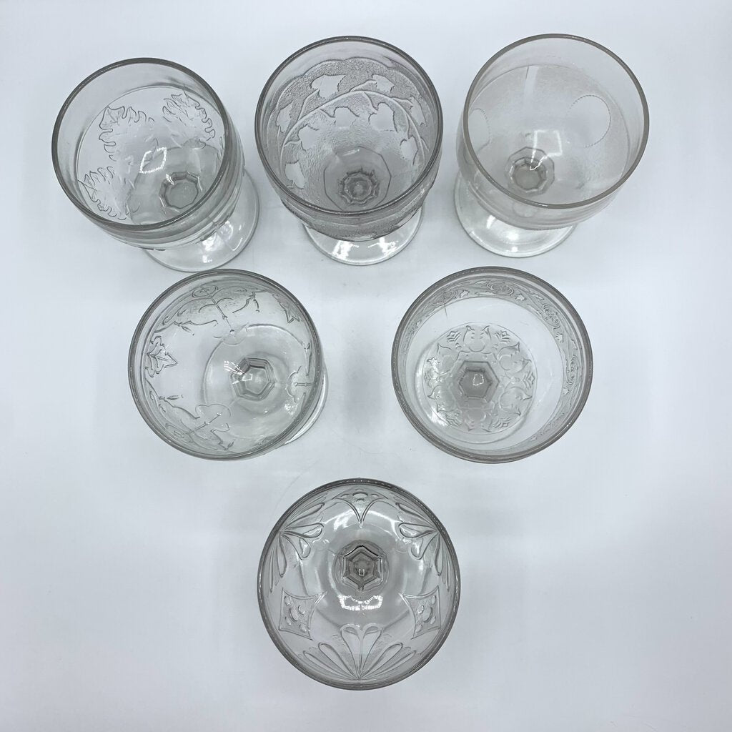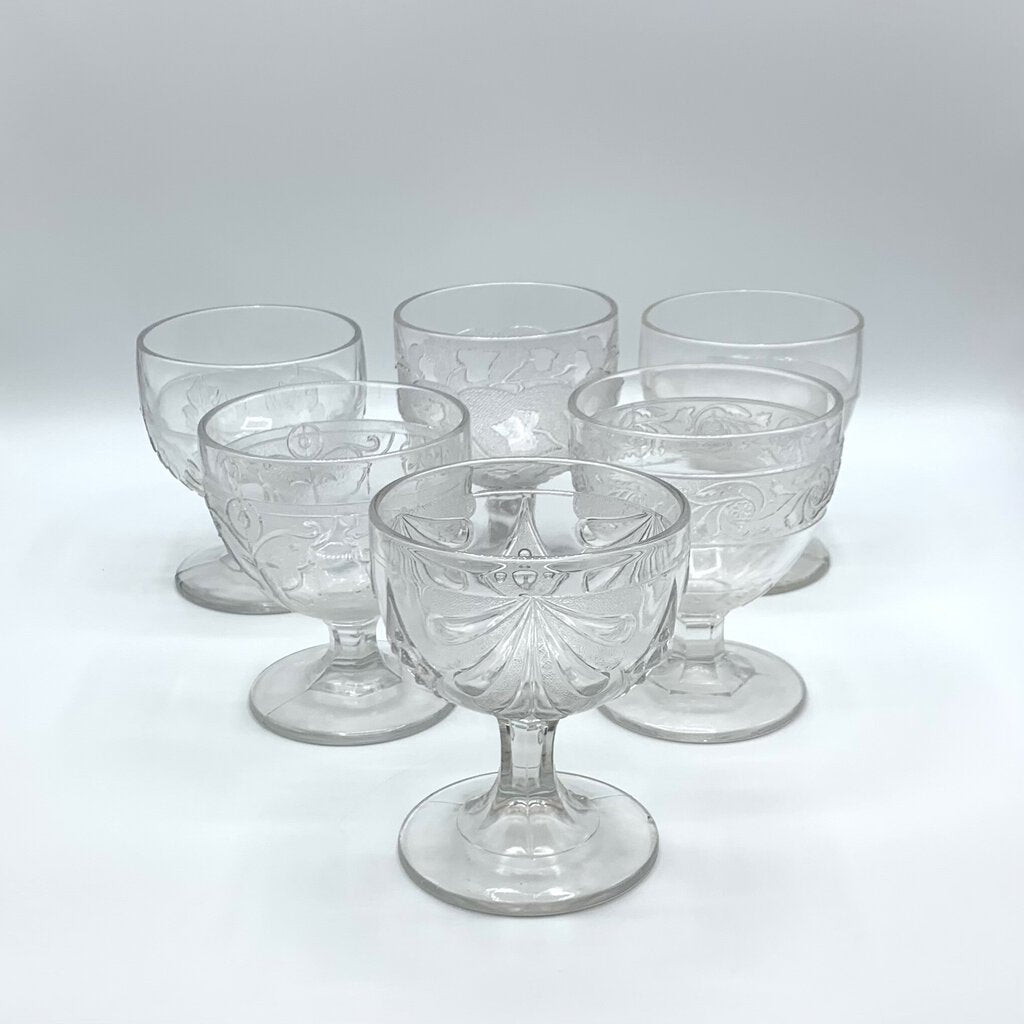 Unique set of 6 EAPG goblets. Upon researching them, I’ve seen them described as buttermilk goblets or pedestal sugar bowls missing their lids. Either way, they are lovely antiques from the later part of the 1800s, and each one features a different pressed pattern.