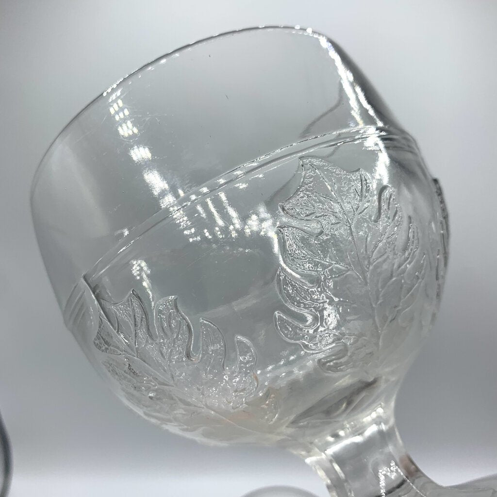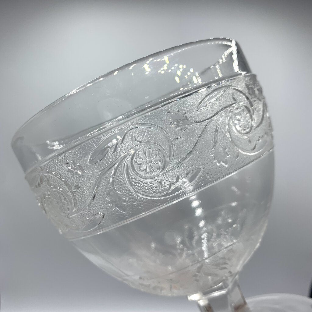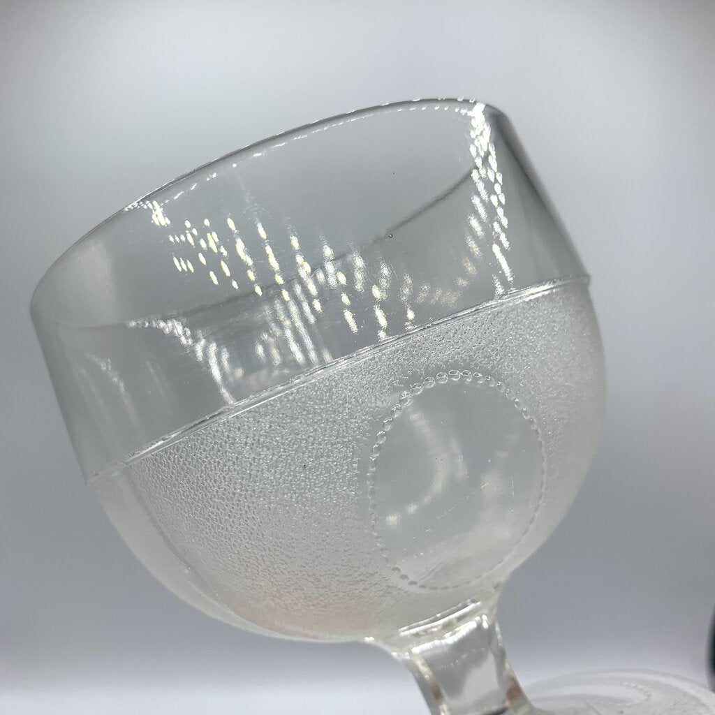The goblets were estate-owned and are in very good vintage condition. You will see some slight discoloration to the glass in some cases, a few bubbles, a scratch or two, and some roughness around some of the edges, but no chips or cracks found. Look closely at the pictures for condition reference.