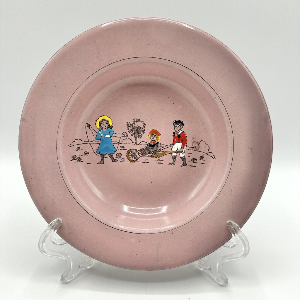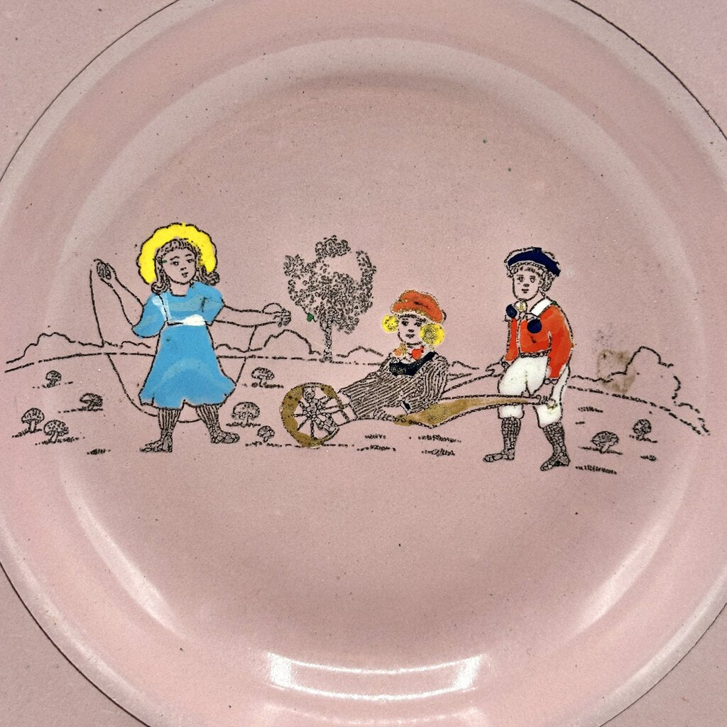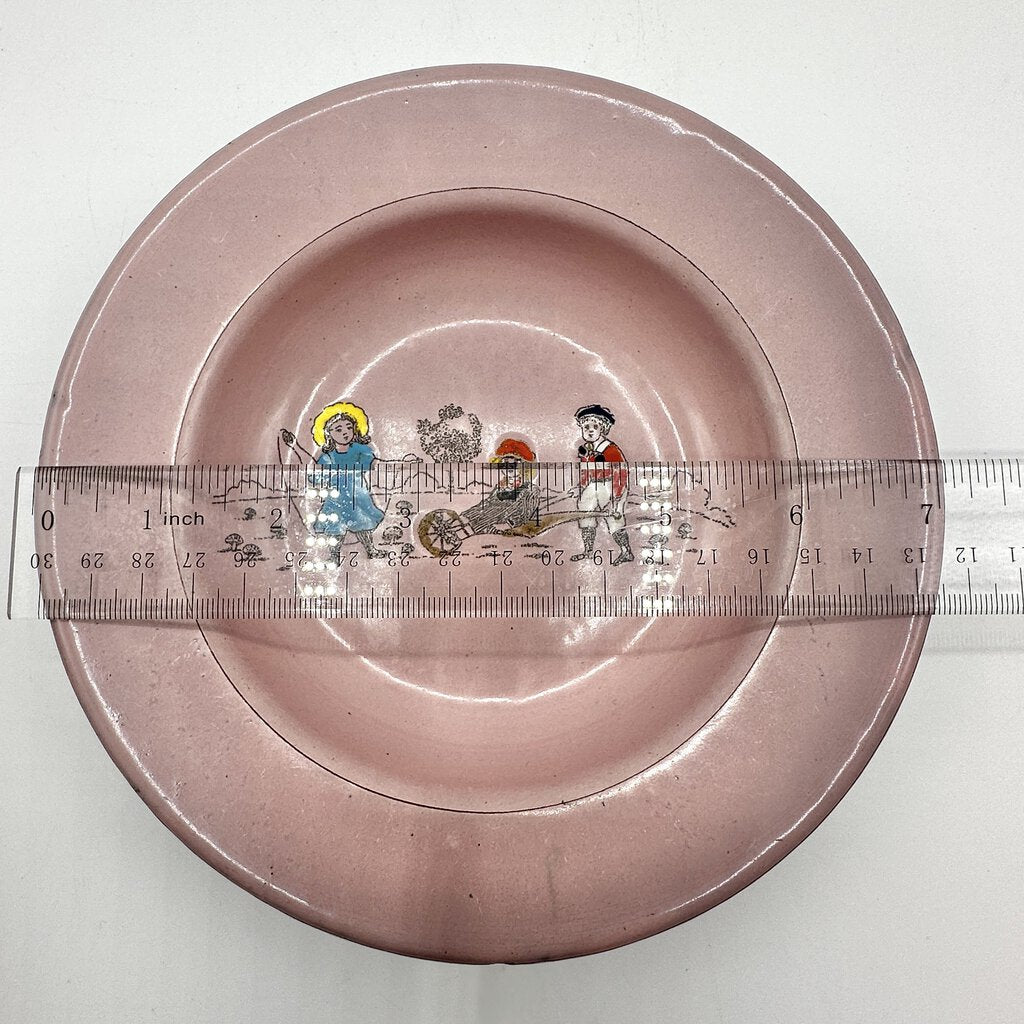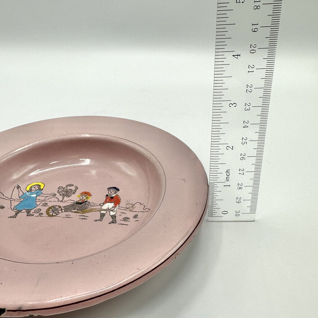 This Antique Enamelware Childs Plate is not marked, but it was most likely made in Germany around the turn of the 20th century. It has a 7 1/4” diameter is a dusty pink color with colorful playing children as the center design. In very good antique condition, it has some light enamel loss around the rim and back. Please see photos for details.