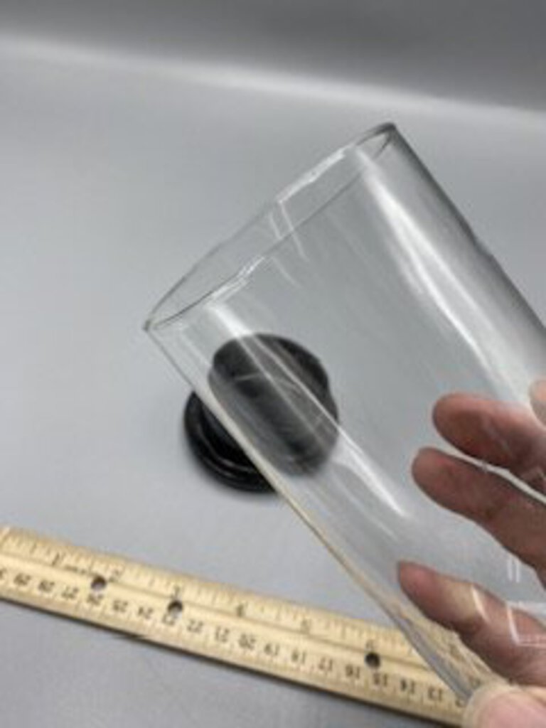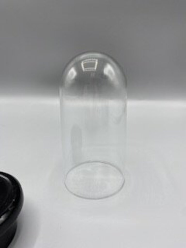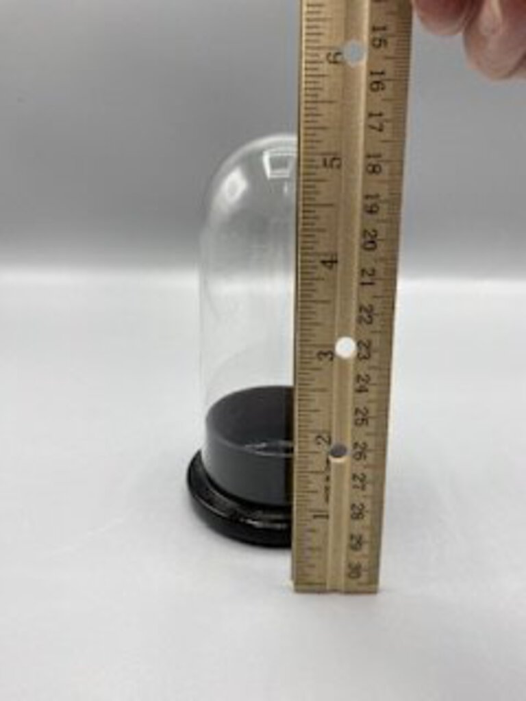Clear Glass Cloche Dome measures 5.5” tall with a solid black glass base that has a 2” in diameter opening to display your fine Collectables. No chips or cracks in glass. Unique piece!