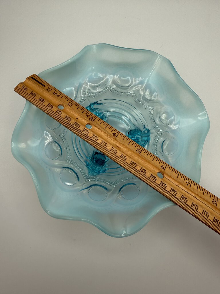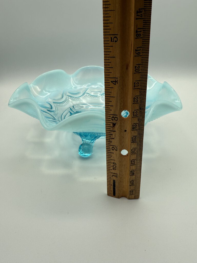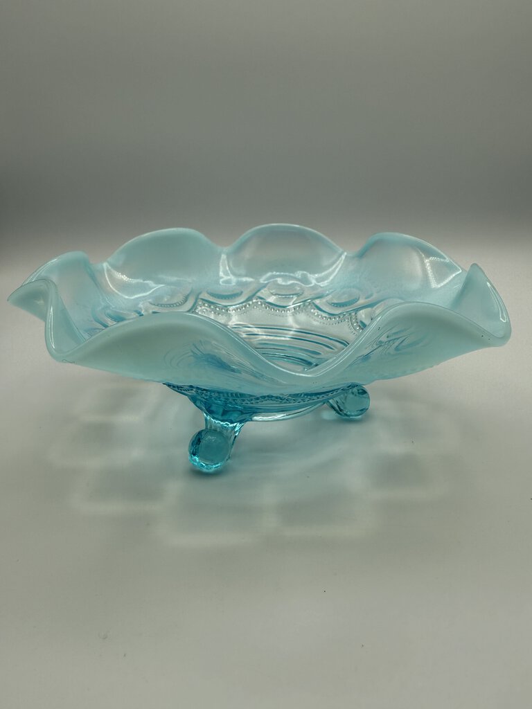 Gorgeous Jefferson Glass Blue Opalescent 3 footed dish. This glass dish measures 7.5” inches diameter and 3” tall. No chips, cracks or cloudiness found in glass.