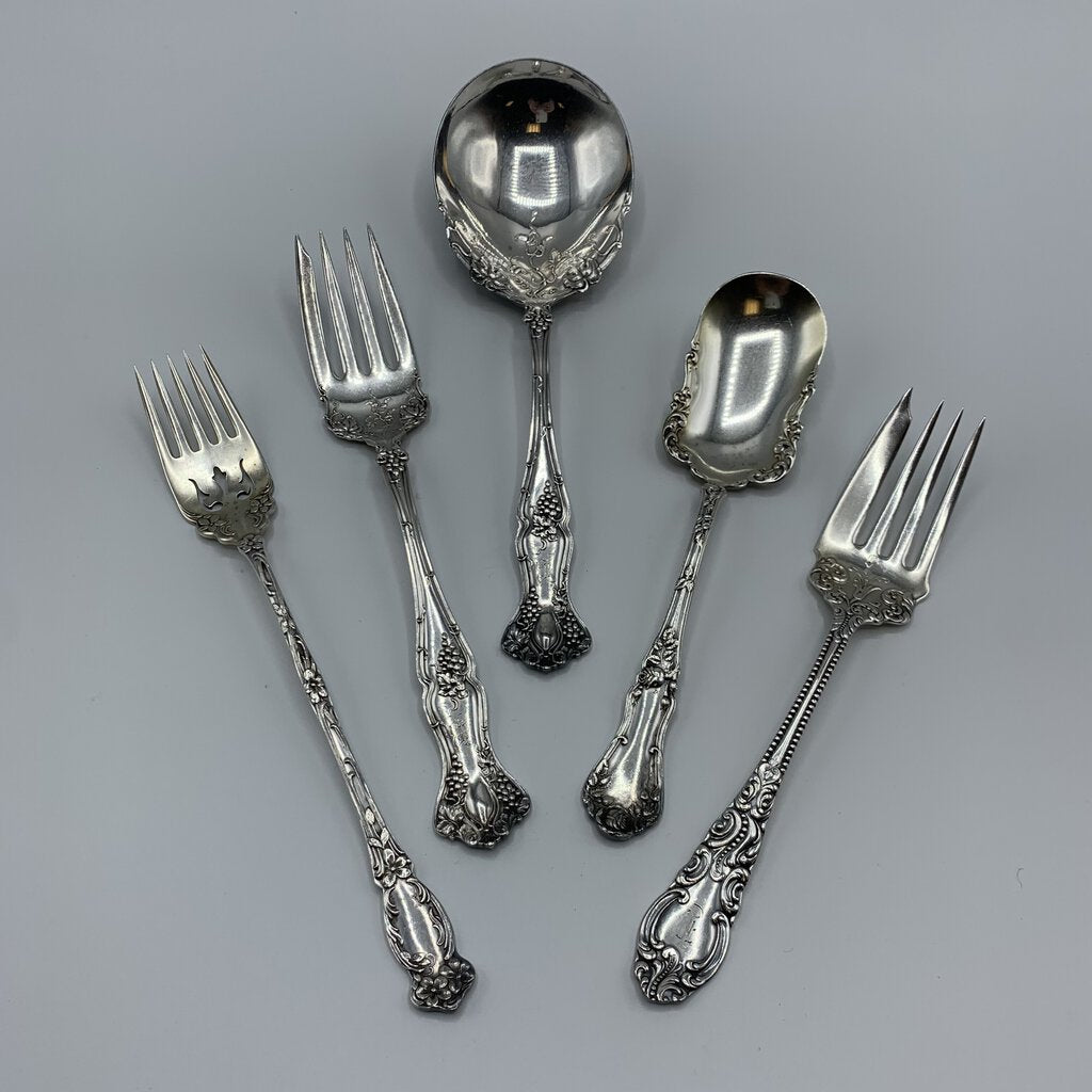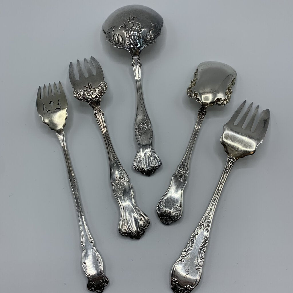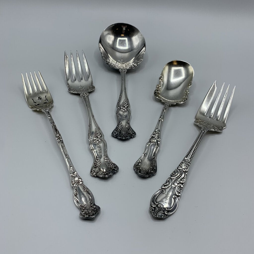 Beautiful and ornate set of 5 silverplate serveware utensils. These pieces will add a timeless elegance and really help to elevate your more formal tablescapes.