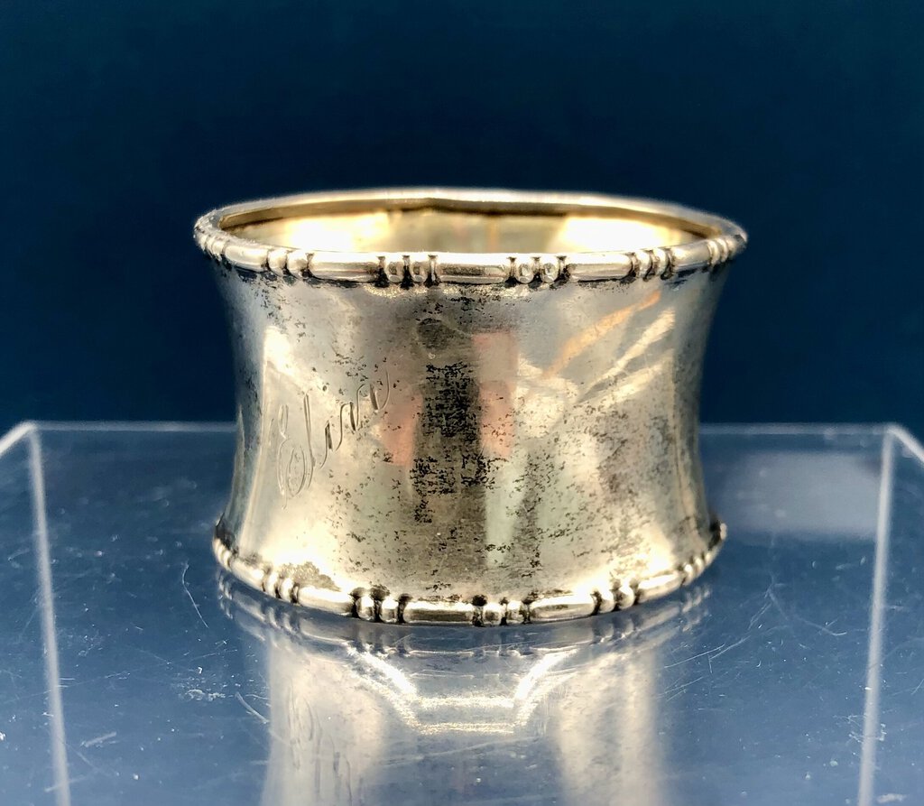 Very nice antique sterling silver napkin ring. Piece is solid with bead and dash edge design.