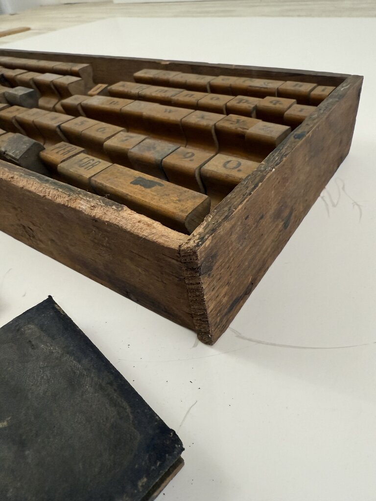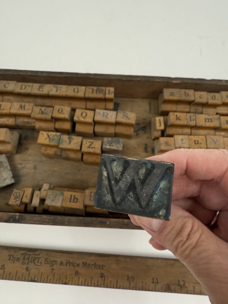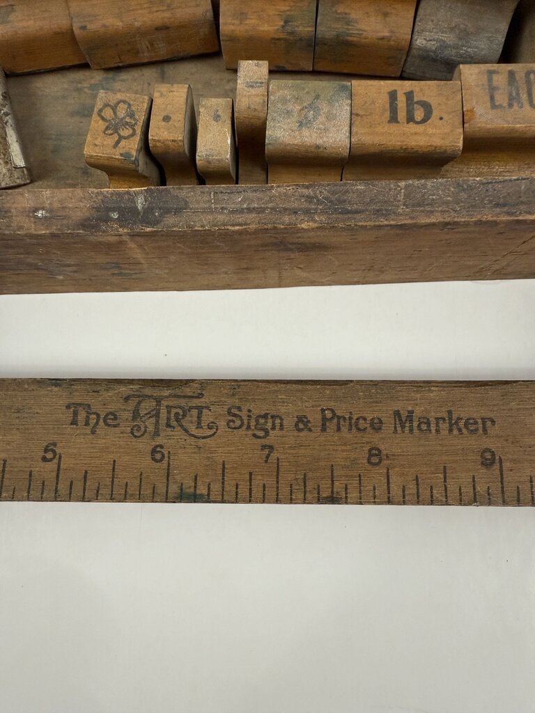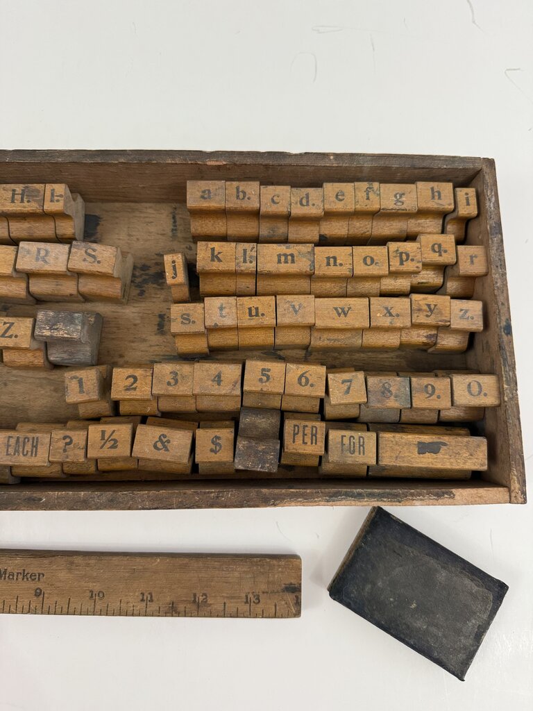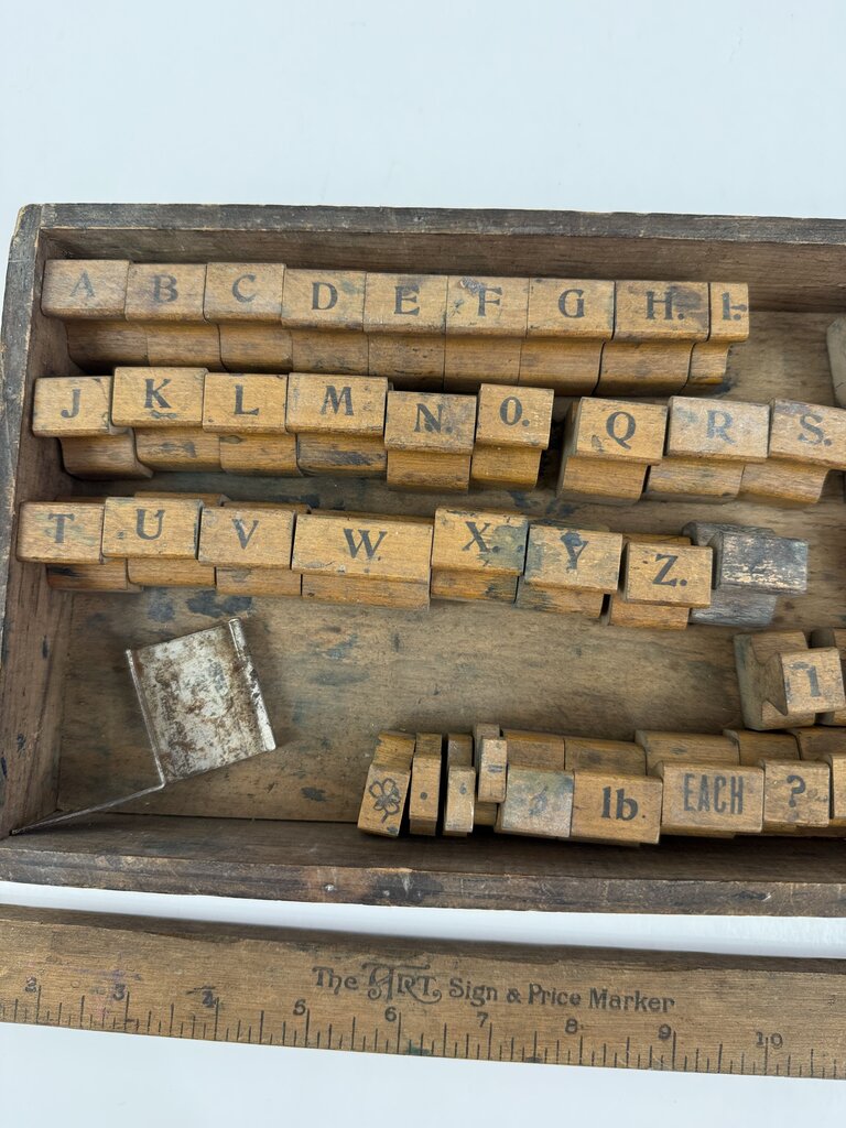 Antique “The Art Sign & Price Marker” sign making set used for sign making at stores. In original wood storage box, no lid. The capital Letters are missing the P, there are two capital Z’s. The lower case letters are complete and the numerals are complete. Seventy seven total stamps with ruler and ink block blotter. No Ink. Not tested with ink. Unique set.