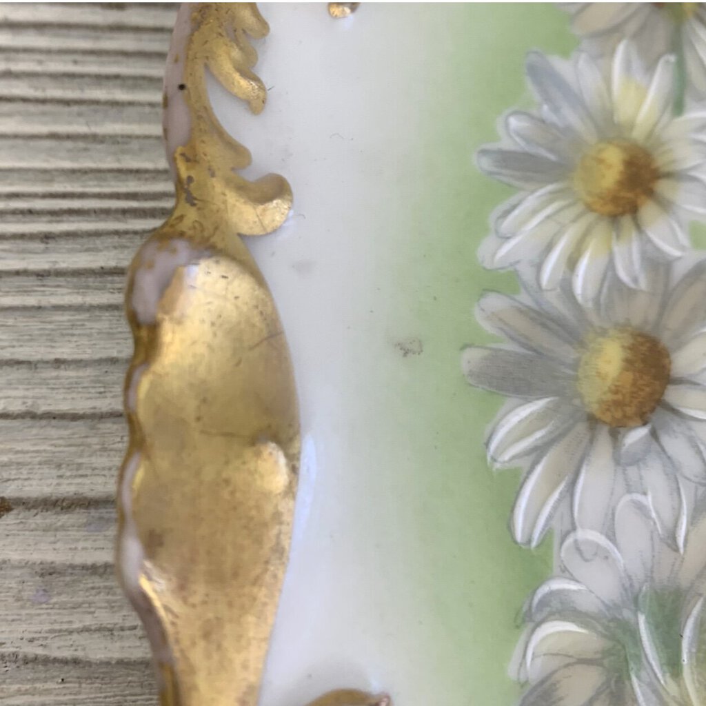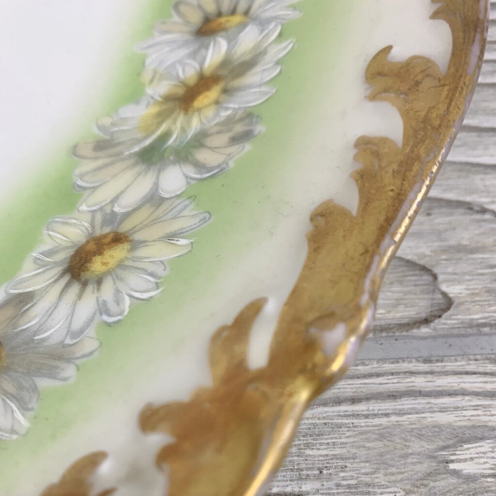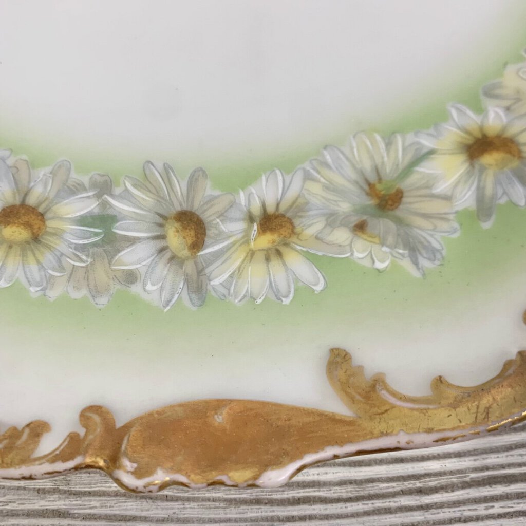 Charming antique platter crafted by Tressemanes and Vogt, Limoges France in the early 1900s. It’s ornate with a lovely gold-gilded edge and whimsical circle of hand-painted daisies. The platter was estate-owned and is in good vintage condition, showing some fading to the gold-gilded edge. The platter measures 12.5 inches in diameter. Please carefully review the photos for condition details and feel free to ask questions.