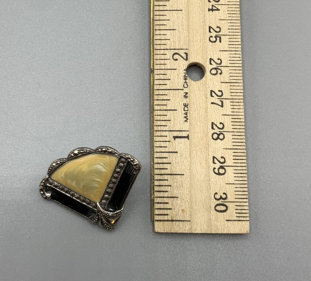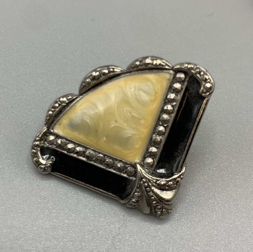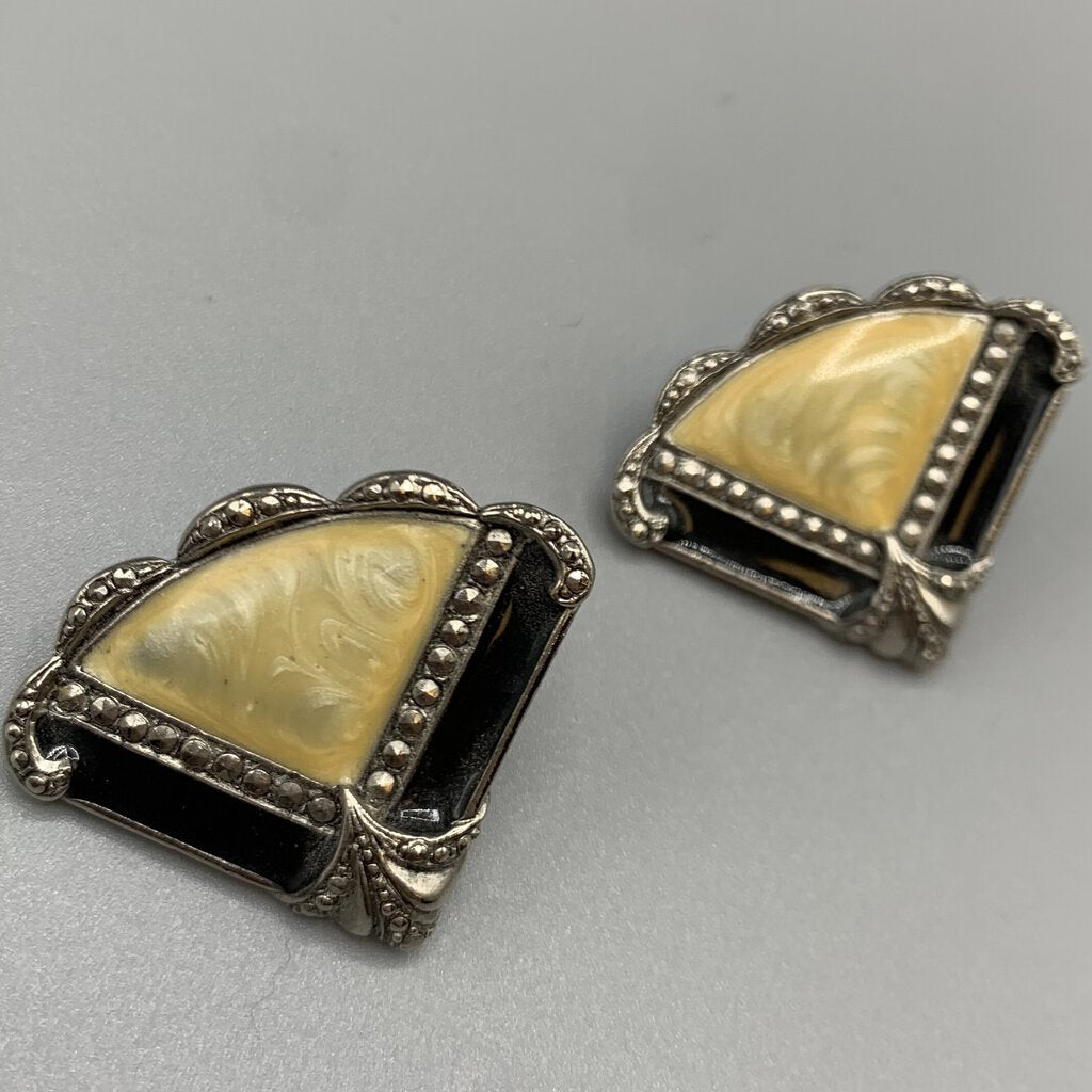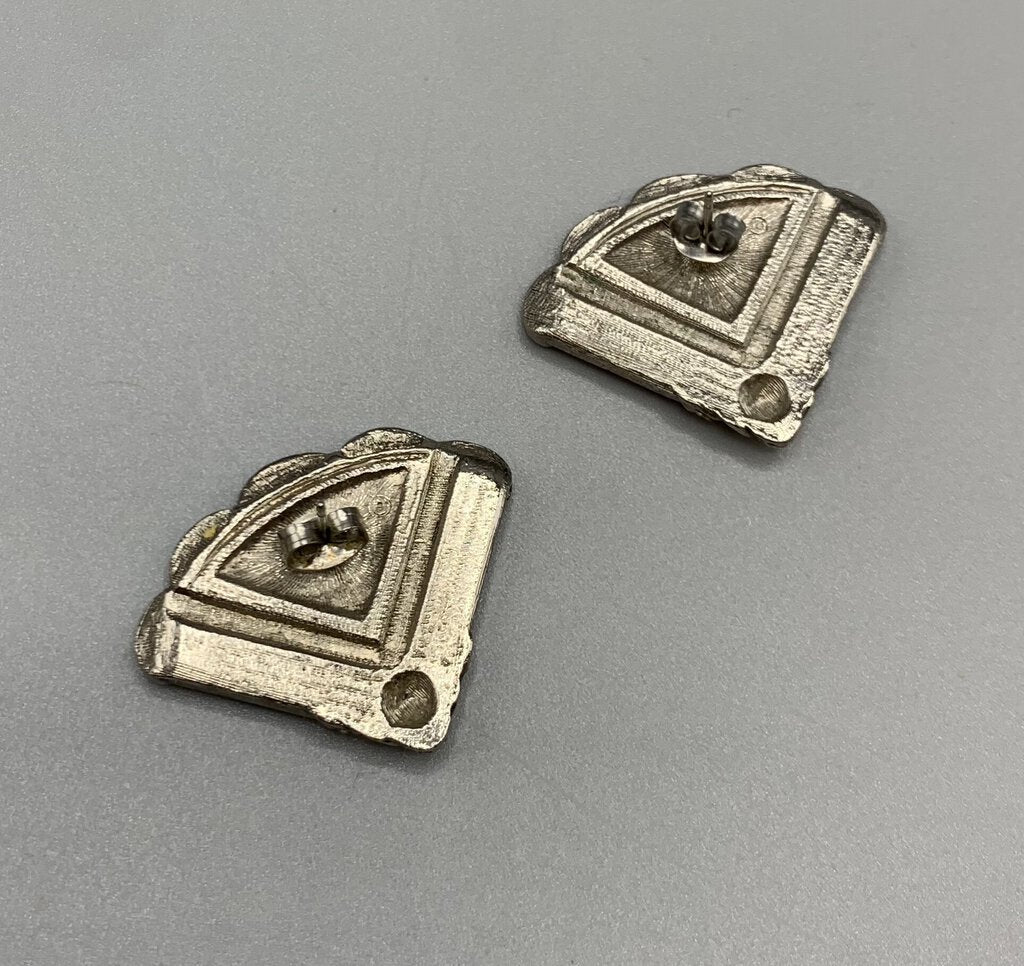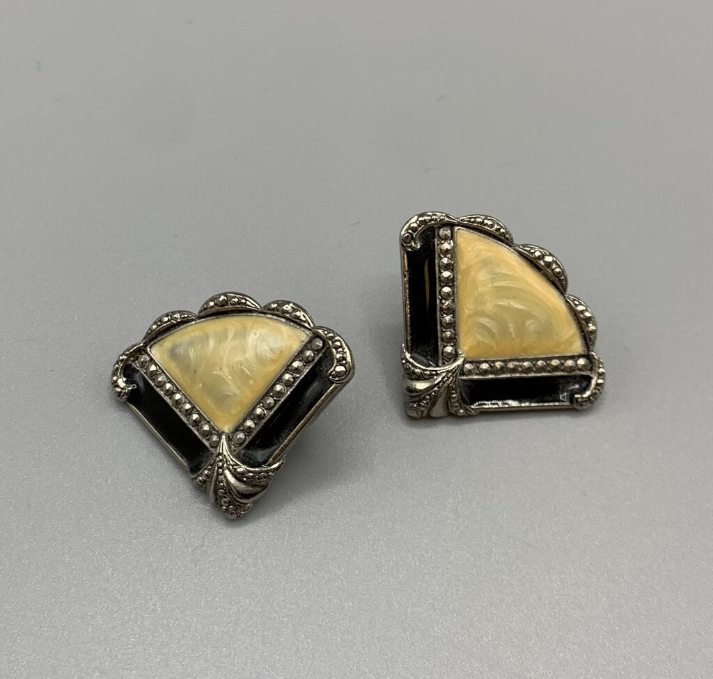 Unique pair of Art Deco-inspired pierced earrings. They look to be dated somewhere between 1980s-1990s, and are enamel on metal.