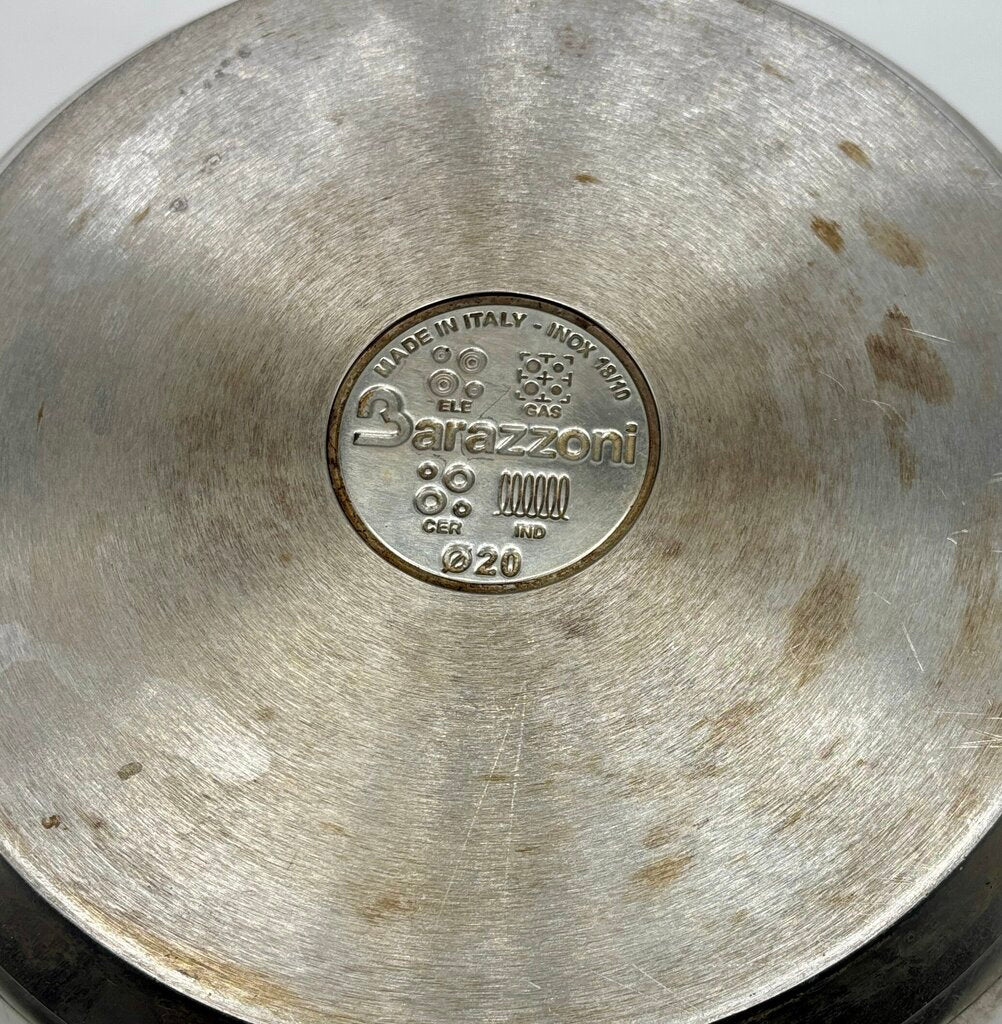 Wonderful Italian made Barazzoni Stock Pot that is perfect for all types of stoves including induction. The double handle pot comes with a lid. It is pre-owned from an estate and shows a few scratches marks. Please review photos for details.